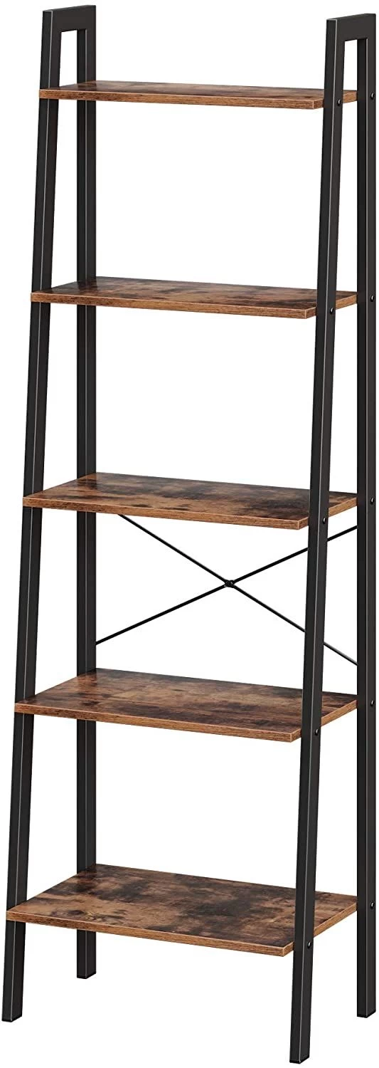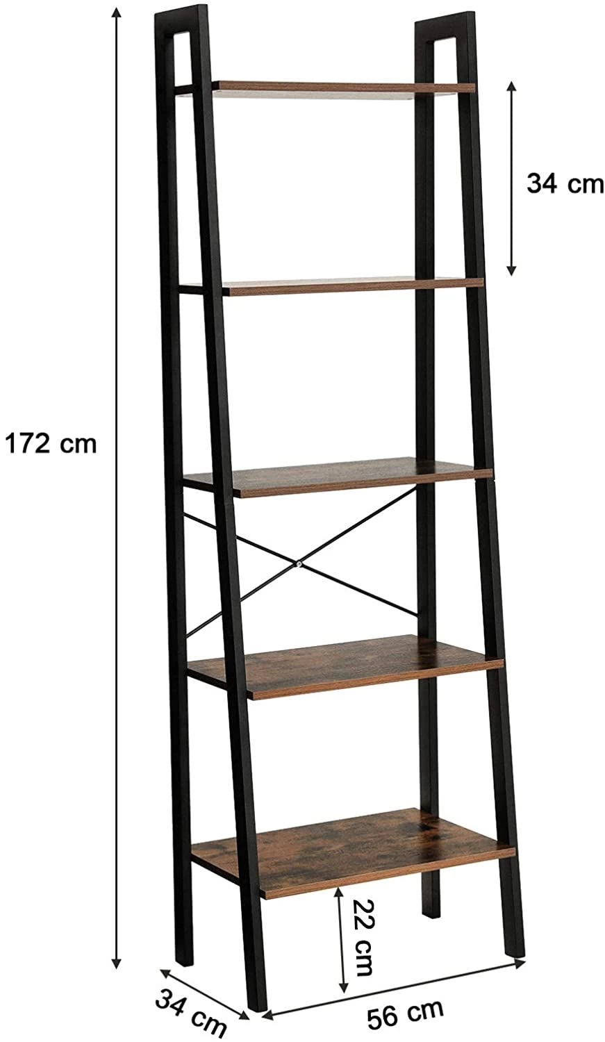 Dit industriële rek met 5 legplanken biedt heel wat ruimte voor bordspellen, boeken, decoratie, opbergmandjes, familiefoto’s… Nog meer opbergruimte nodig? Plaats het bijpassende hoekrek aan weerskanten van het rek, om een extra groot exemplaar te verkrijgen. Het rek is gemaakt van zwart metaal en rustiek bruin spaanplaat. Belastbaar gewicht per legplank: 5 kg