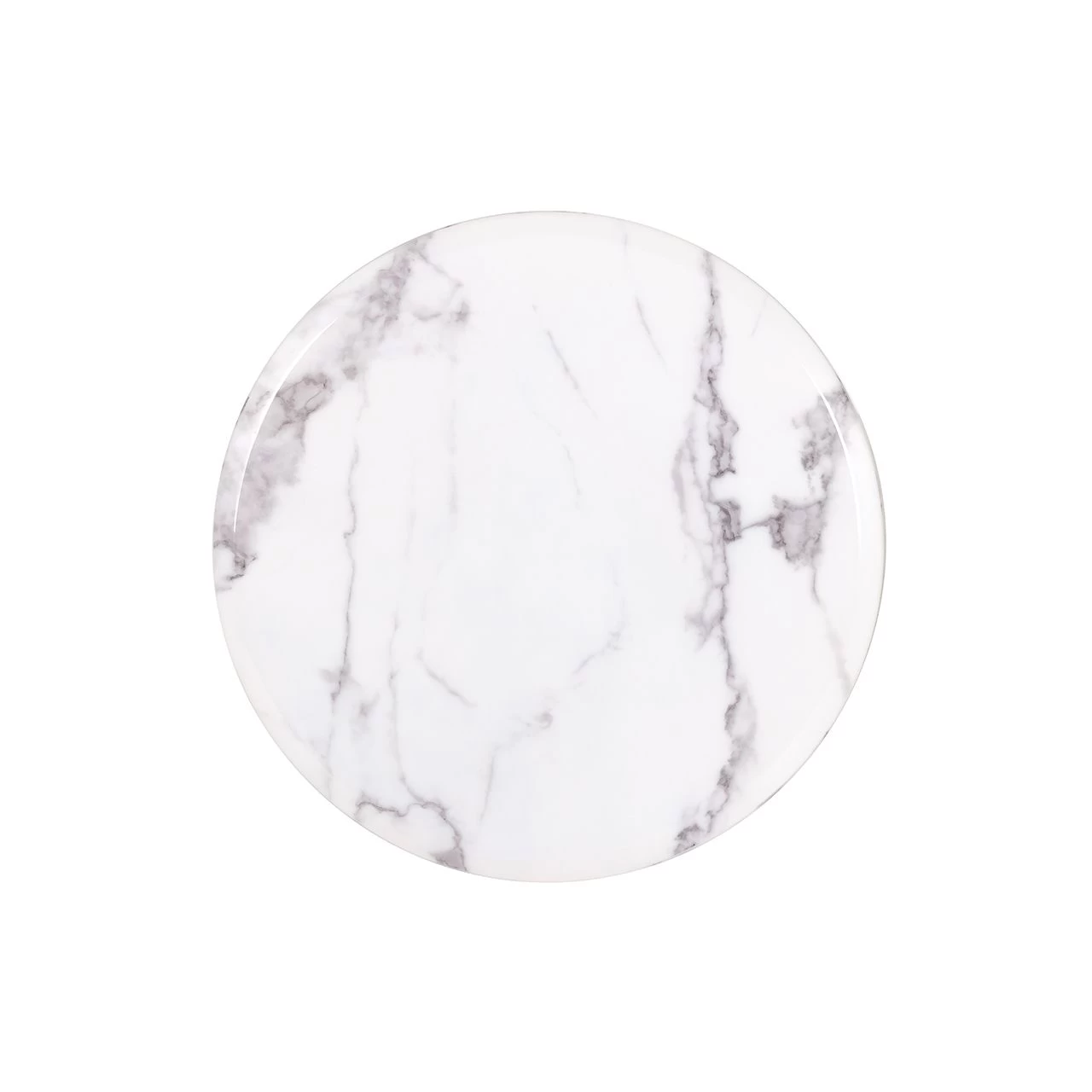Rond bijzettafeltje Degas met diameter 50cm. Frame in zwart roestvrij staal, tafelblad in wit imitatiemarmer.