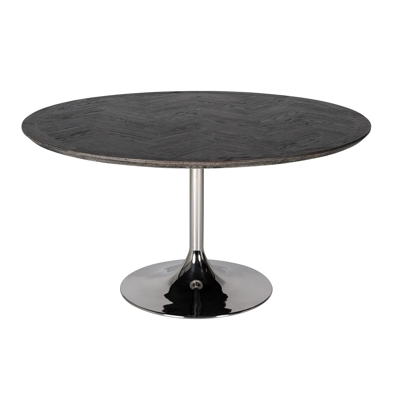 Ronde eettafel Bony met diameter 140cm, gemaakt uit zwart eiken en een zilvergrijs frame in glimmend roestvrij staal.