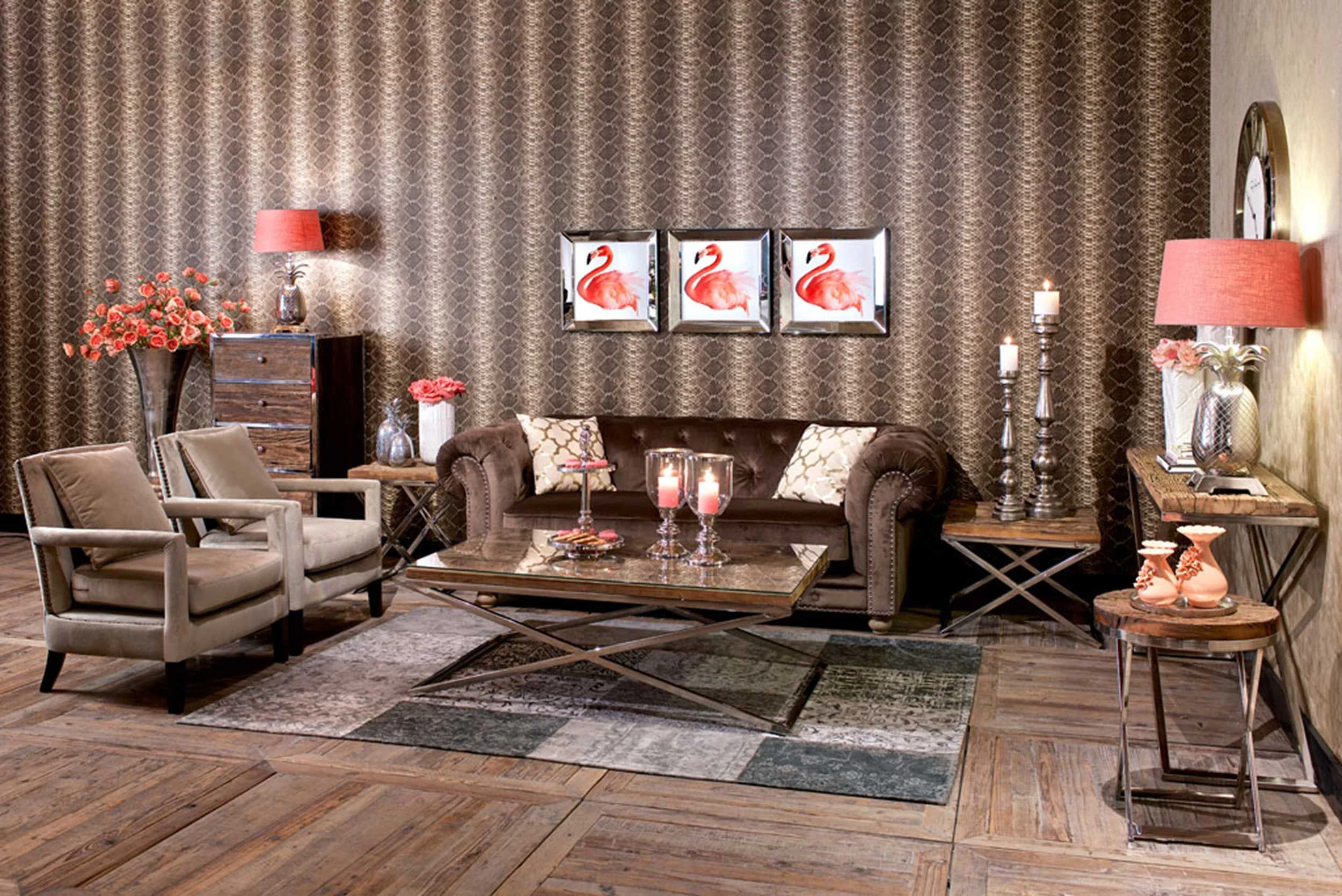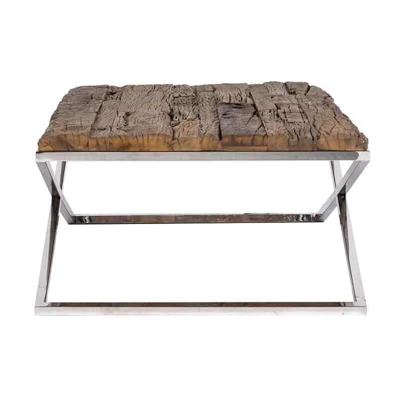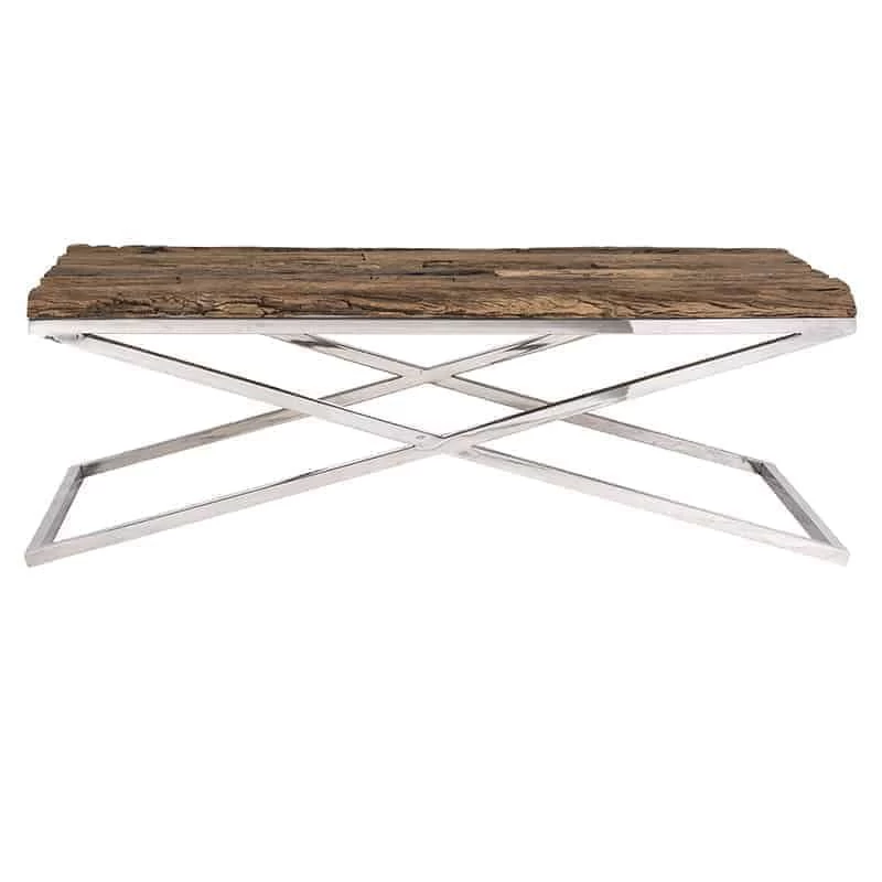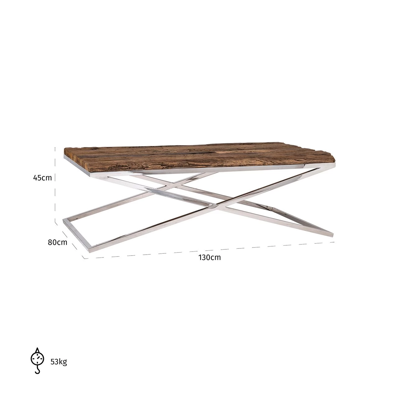 Salontafel Kensington 130x80cm in bruin en zilver, gemaakt uit gerecycleerd hout en zilvergrijs, blinkend staal.