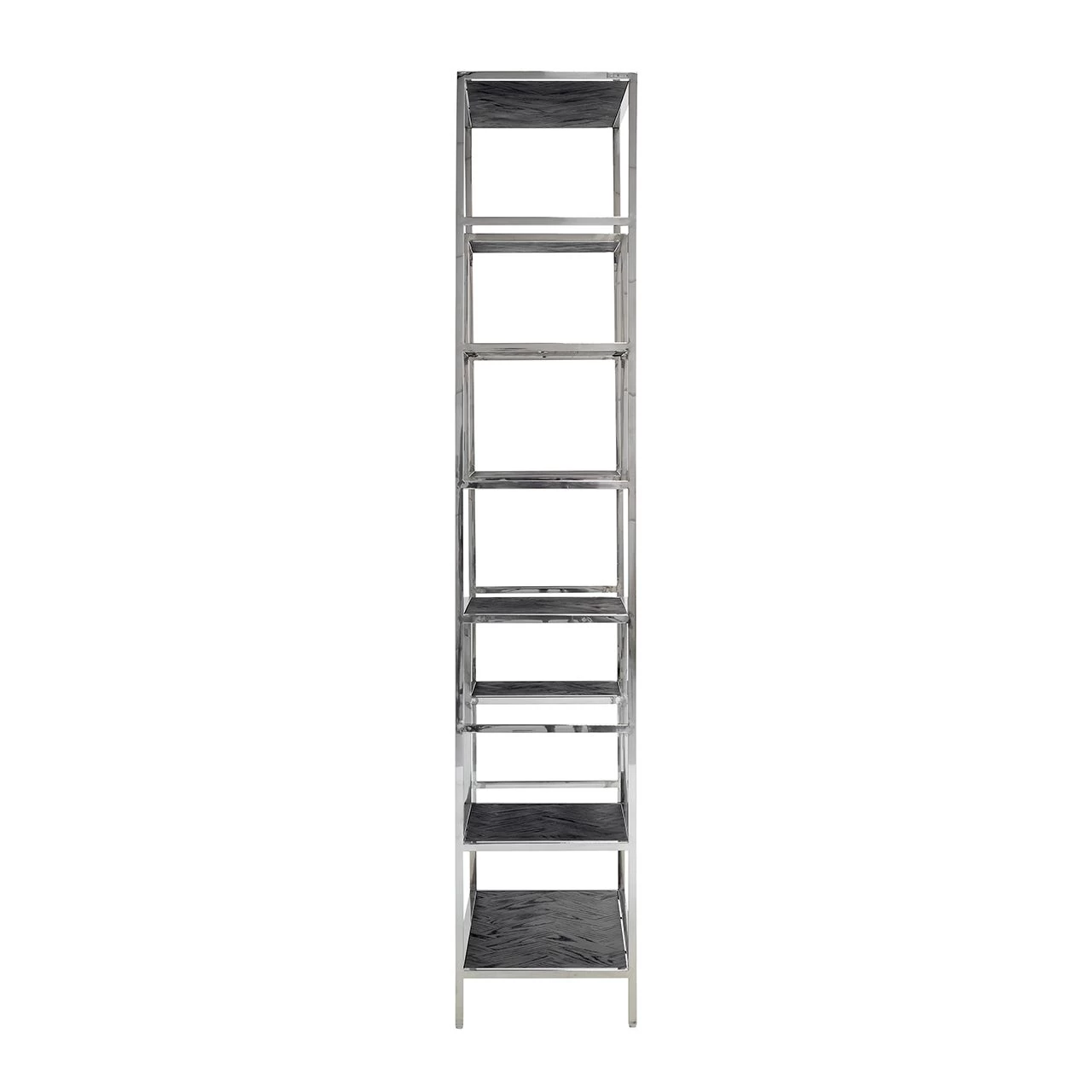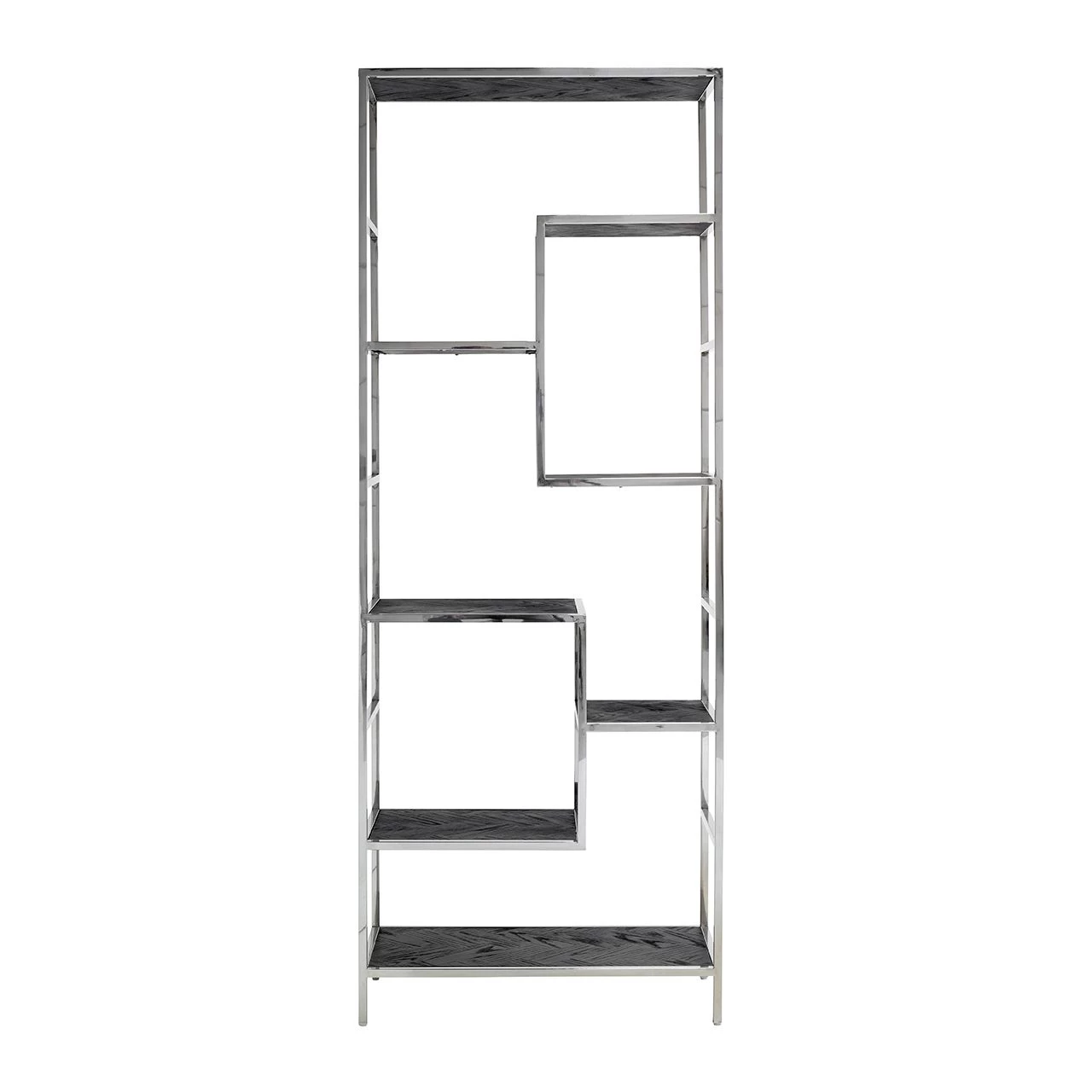 Wandrek Bony, gemaakt uit een zilvergrijs frame in roestvrij staal en legplanken in zwart eikenhout.