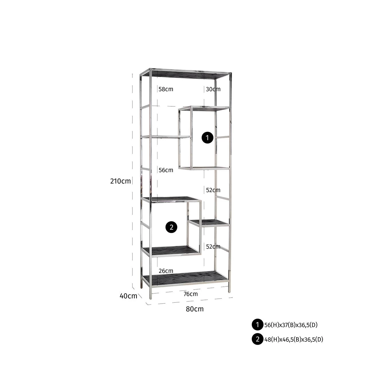 Wandrek Bony maakt onderdeel uit van de uitgebreide collectie in zwart eikenhout met zilvergrijs frame in roestvrij staal. Die combinatie zorgt voor een erg klassevolle look in je interieur. De zeven legplanken van verschillende grootte geven talloze mogelijkheden om je accessoires in de verf te zetten. De elegante, maar stoere kast is ook verkrijgbaar in een uitvoering van eikenhout met zilver én een lagere versie. Ontdek de verschillende andere woonkamermeubelen uit deze collectie bij Emob!