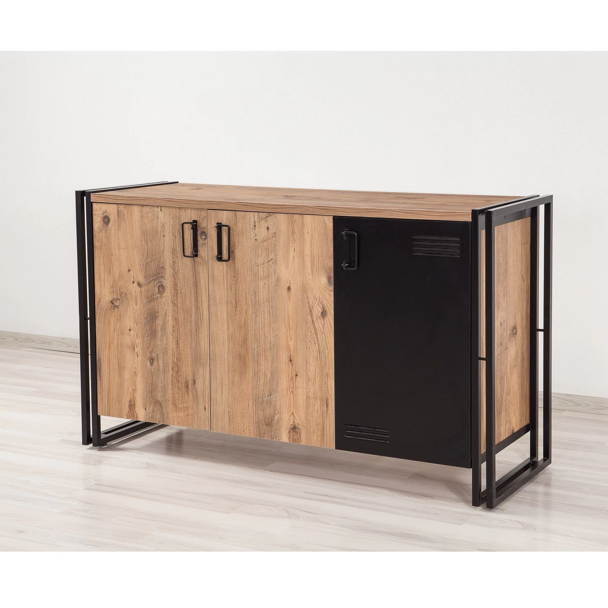 Saffier Console: Een stijlvolle console gemaakt van gemelamineerd spaanplaat, met een metalen frame, metalen deur en handgrepen, verschillende planken en kan aan de muur bevestigd worden. Afmeting: 140cm x 80cm x 45cm. Kleur: Atlantic Pine Zwart