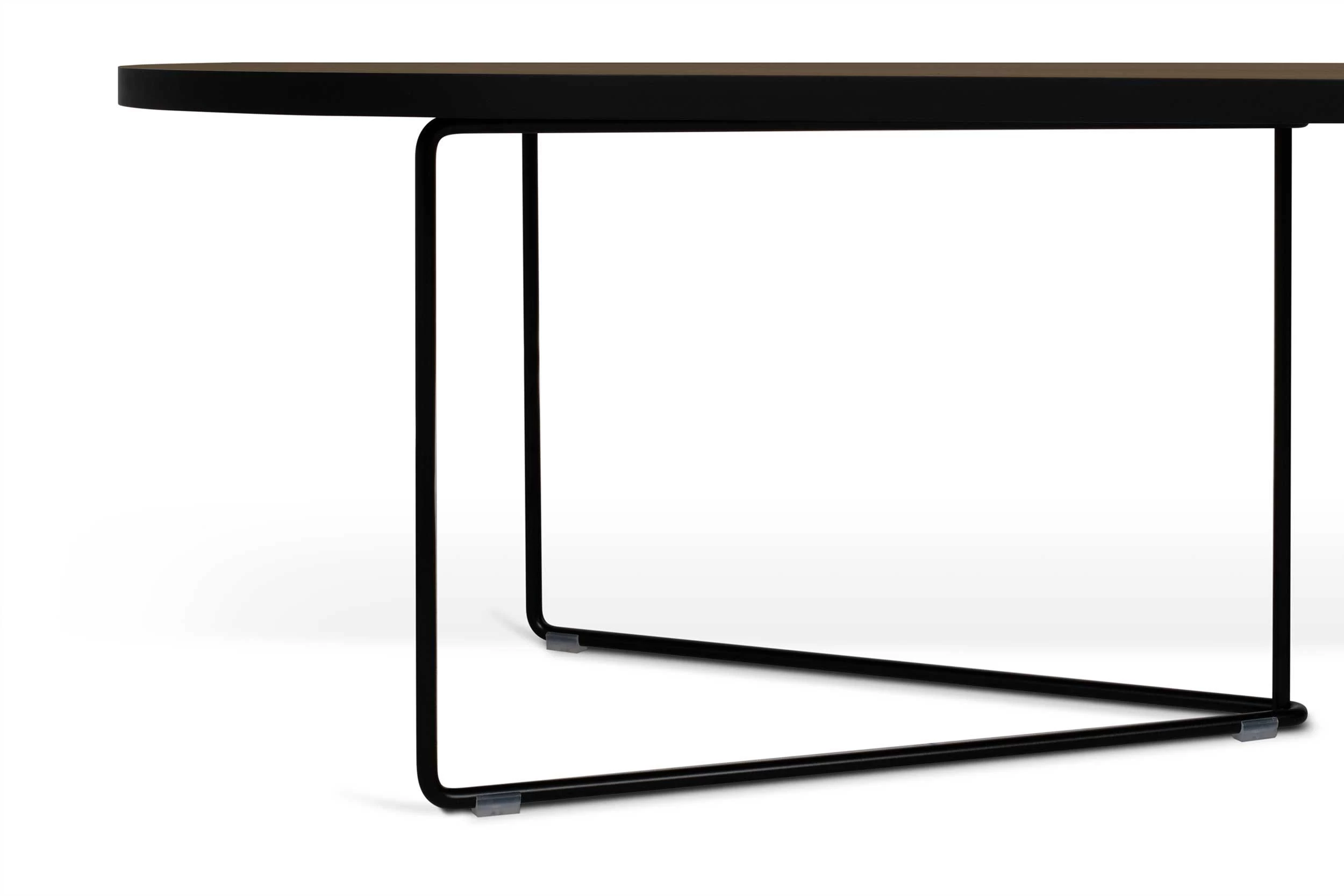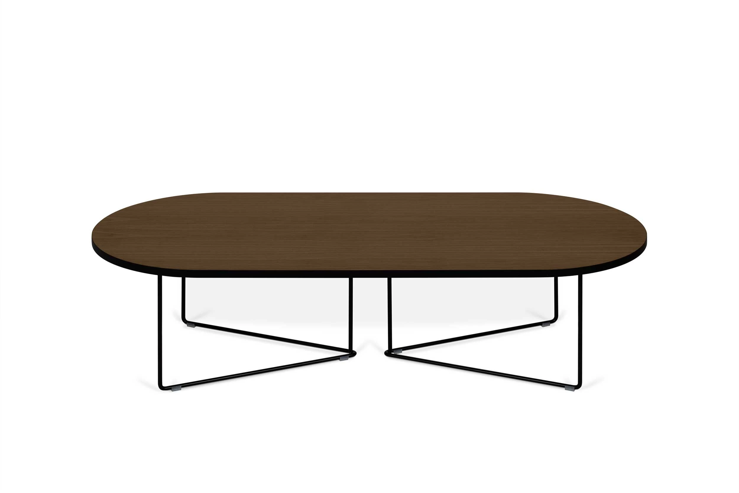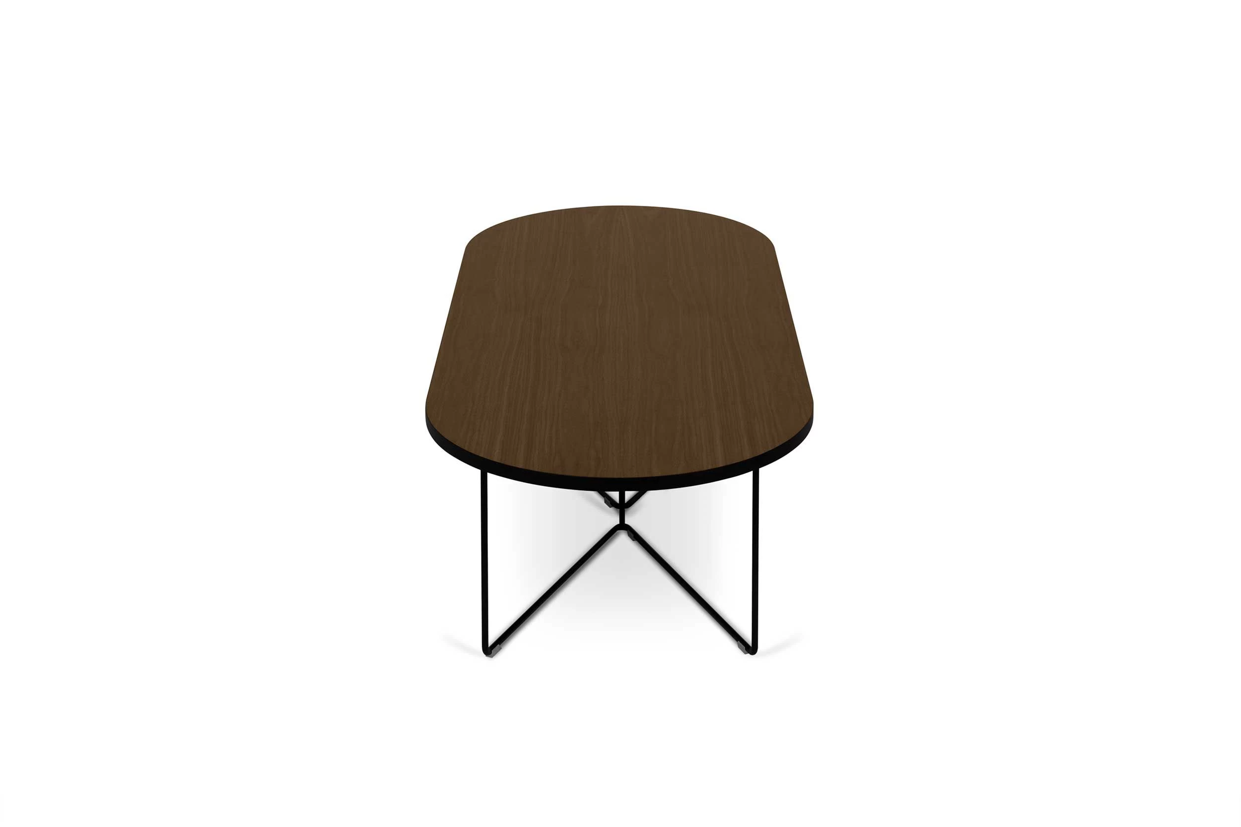 Ovalen salontafel Adil, gemaakt uit spaanplaat en zwarte poten. Afwerking in walnootfineer.
