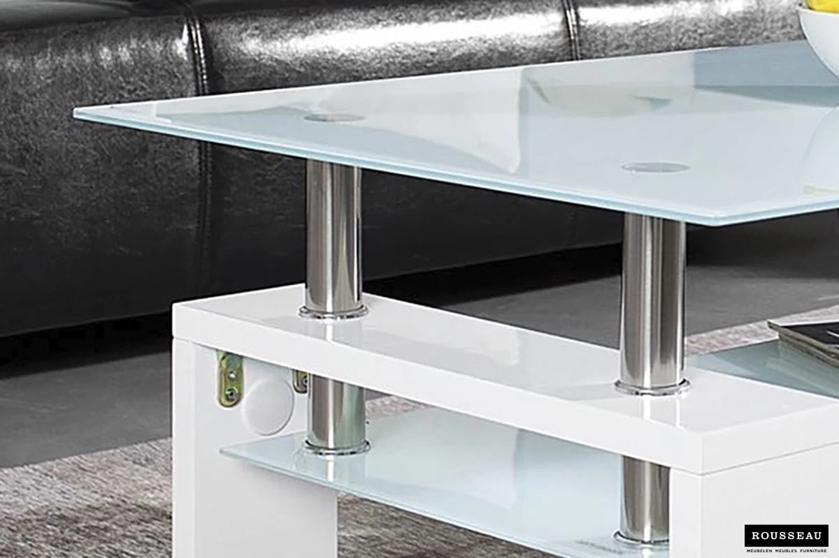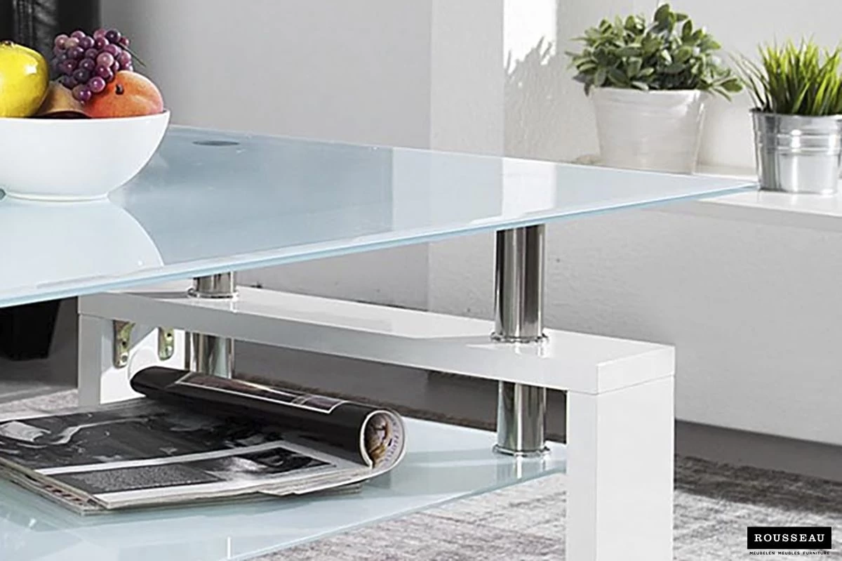 Op zoek naar een design salontafel? Dan zit je met dit model zeker goed. De combinatie van het glas met het glanzend witte decor zorgt voor een mooi effect. Op de glazen plaat presenteer je met stijl jouw hapjes en drankjes. Op de legplank eronder kan je magazines, boeken,… kwijt. Kortom, dit moderne meubel is absoluut onmisbaar in jouw salon.