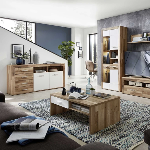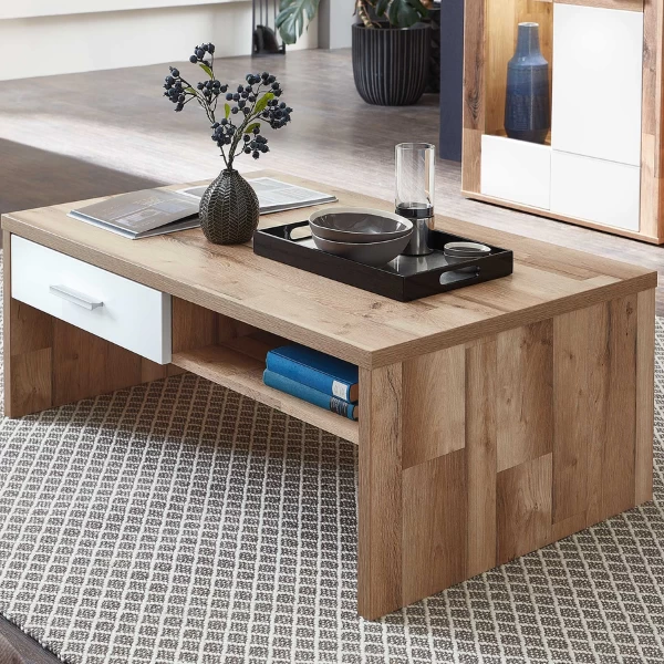 Salontafel Blake 110x65x40cm uit spaanplaat met afwerking in imitatie-eik en wit. Met twee lades.