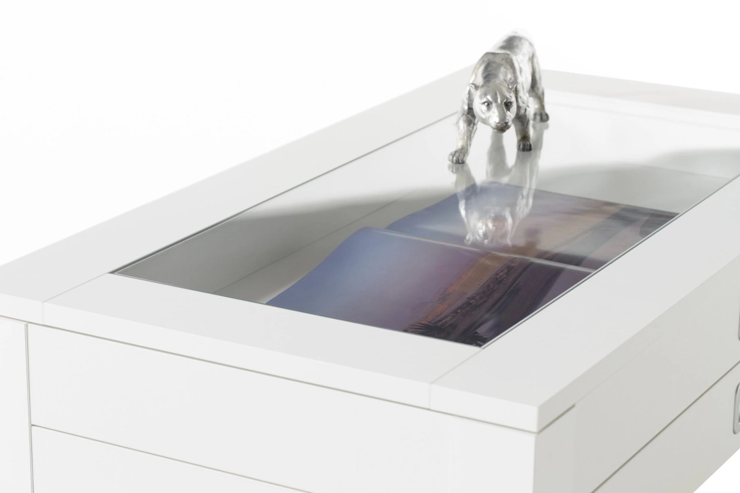 Dit mat witte salontafelmeubel uit spaanplaat is perfect voor de verzamelaar die zijn favoriete spullen in het zicht wil hebben, gezien het tafelblad in transparant glas. Maar evengoed kan je een tijdschrift, krant of je afstandsbediening netjes opbergen in een van de twee lades, die zijn uitgerust met aluminiumkleurige handgrepen. De stevige poten in MDF zorgen voor de noodzakelijke stabiliteit. Het tafeltje kan tot wel 25 kg belast worden. Een leuk salontafel voor wie eens wat anders wil in de woonkamer!