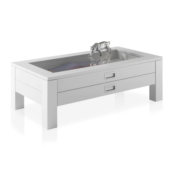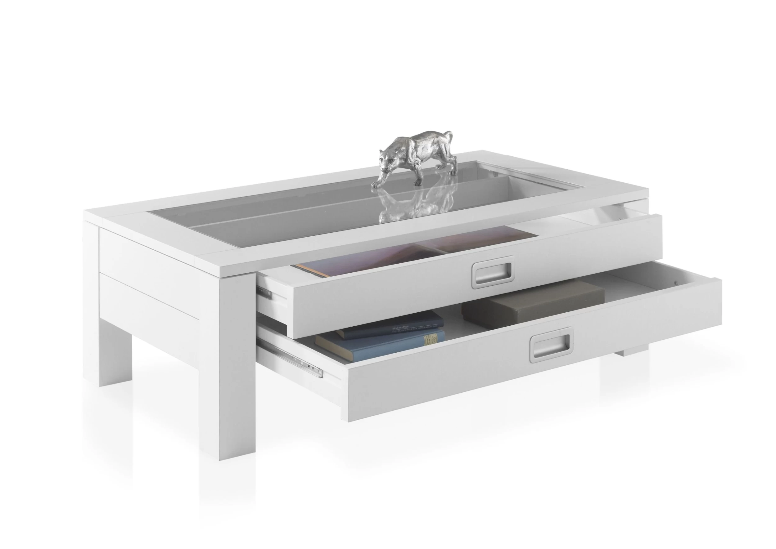 Mat witte salontafel Cancelo met 2 lades, gemaakt uit spaanplaat en MDF en tafelblad in glas.