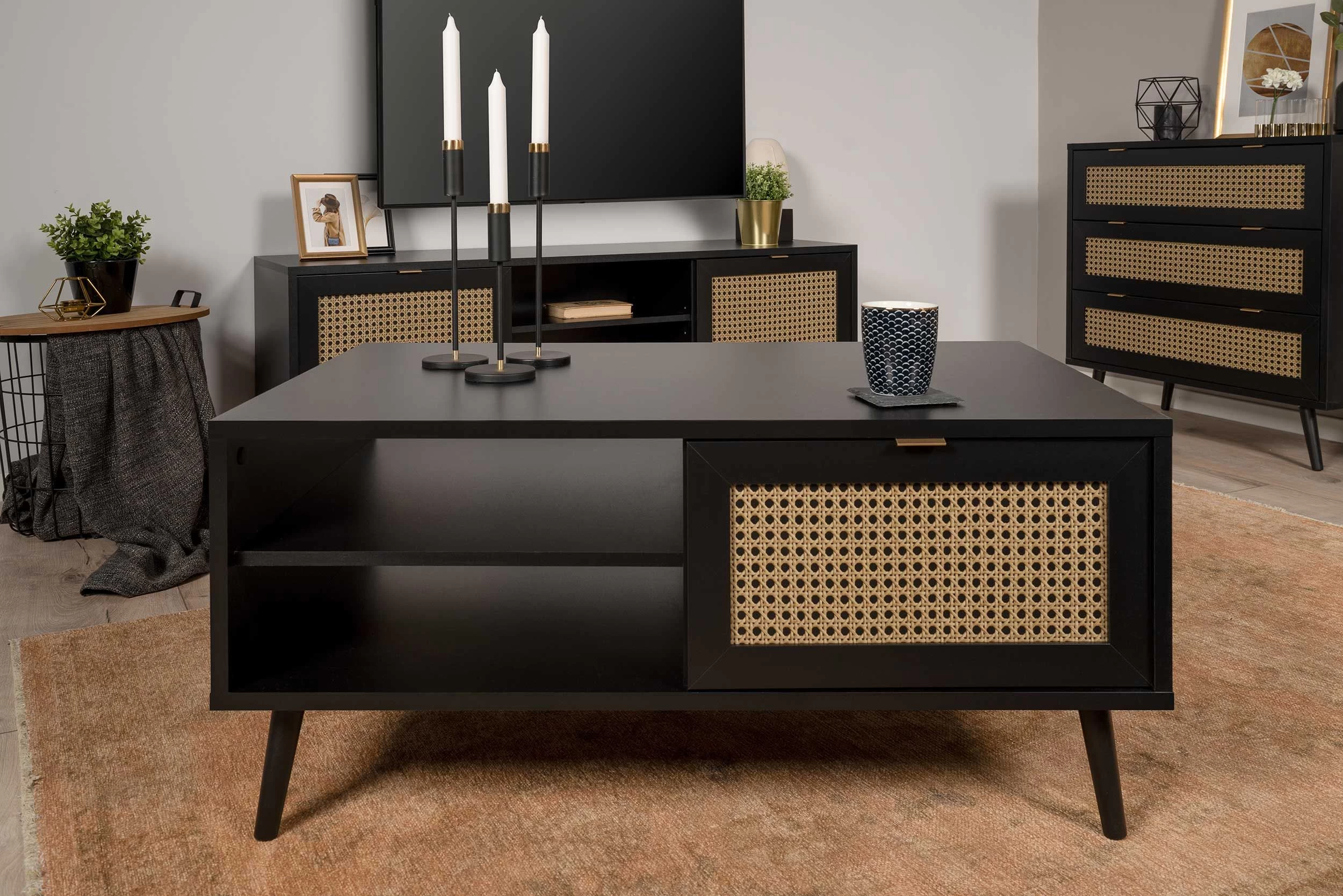 Deze meubelreeks Daka kan bestempeld worden als klassiek met moderne invloeden. De strakke zwarte uitvoering contrasteert harmonieus met het decor van natuurkleurig vlechtwerk, op de deuren geprint. Dit betreft geen echt vlechtwerk.