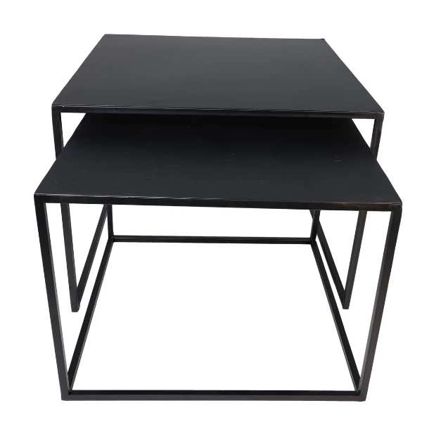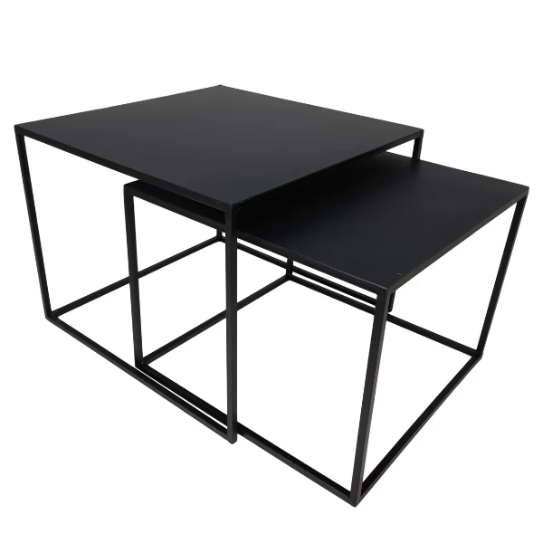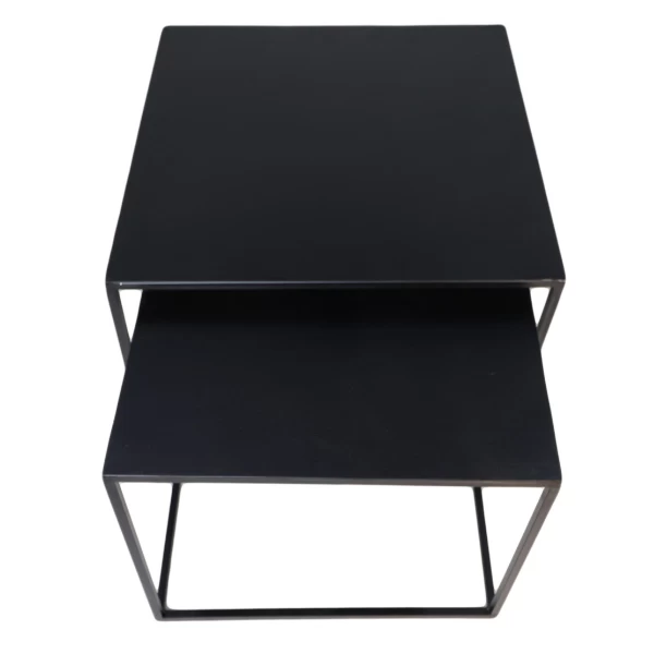 Salontafel set van 2 uit metaal. Afwerking in zwart. De grootste tafel is 42 cm hoog en het blad is 55×55 cm. De kleine tafel 37 cm hoog en het blad 50×50 cm.