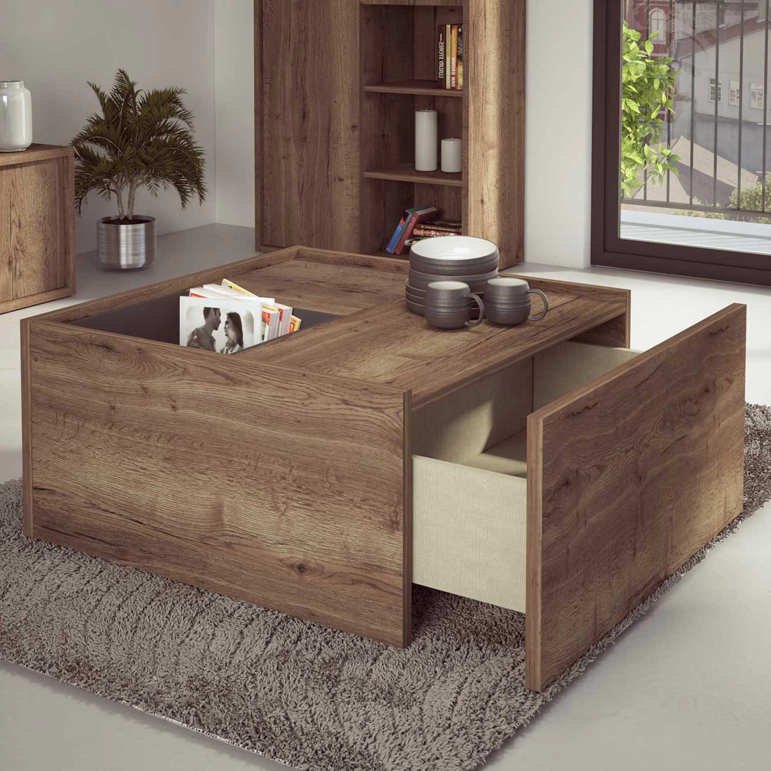 Deze vierkante salontafel zal je verbazen door haar weldoordachte design. In het tafelblad is namelijk een dieper gelegen open vak verwerkt. Aan de zijkant vind je ook nog eens een lade om allerlei spullen in op te bergen.
