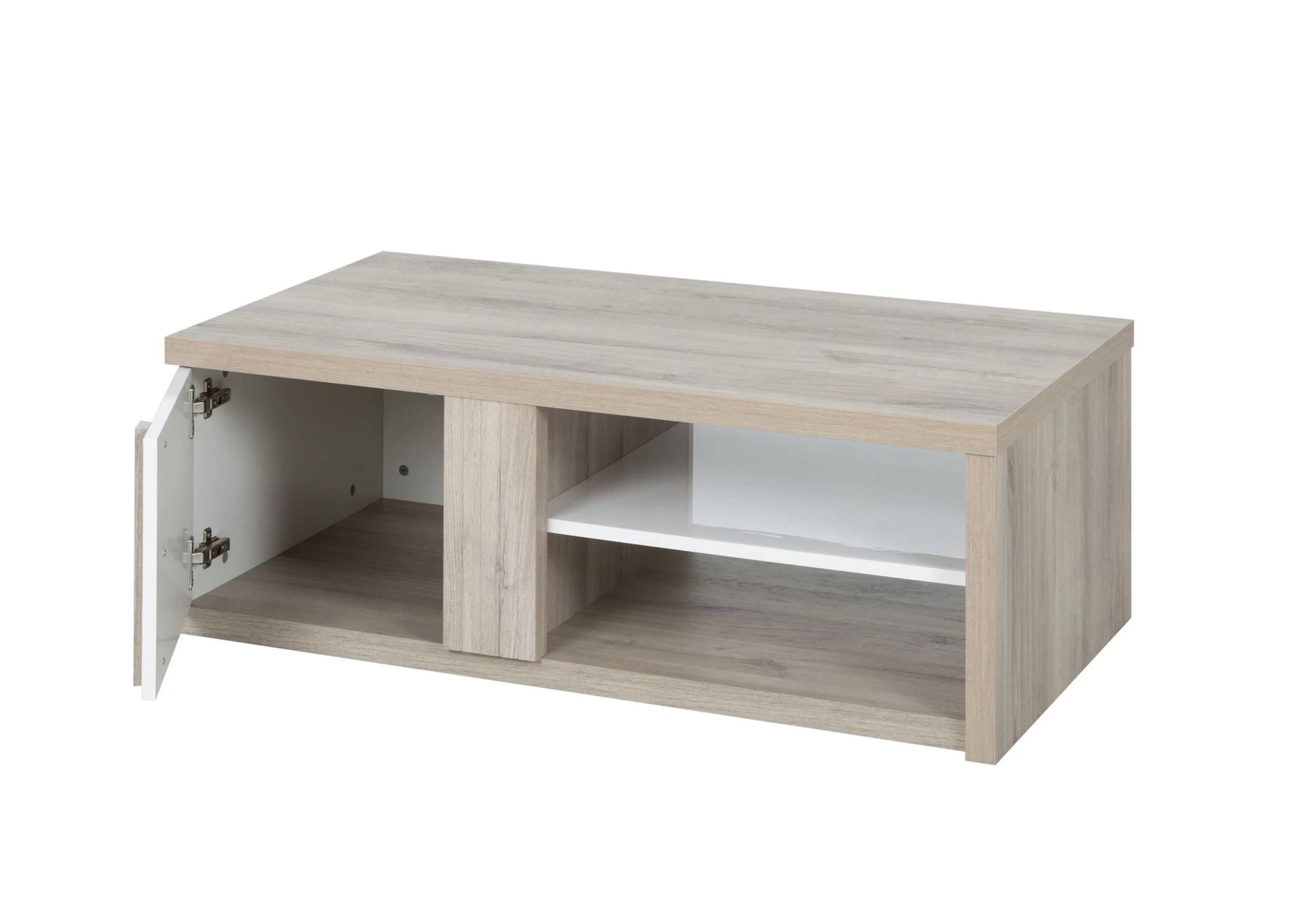 Deze salontafel heeft een 35 mm dik blad en beschikt ook over een kastje met een deur en 2 opbergvakken.