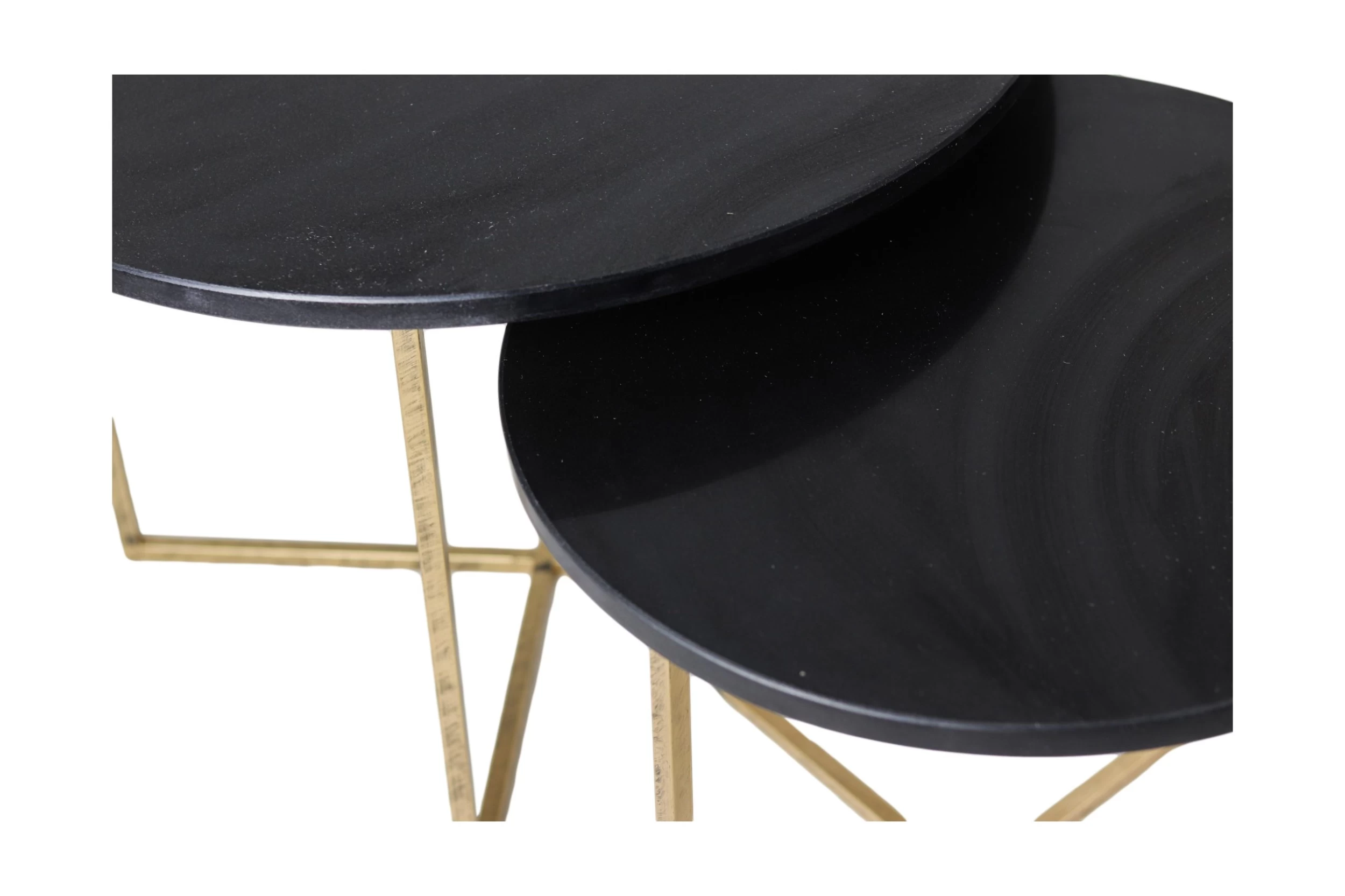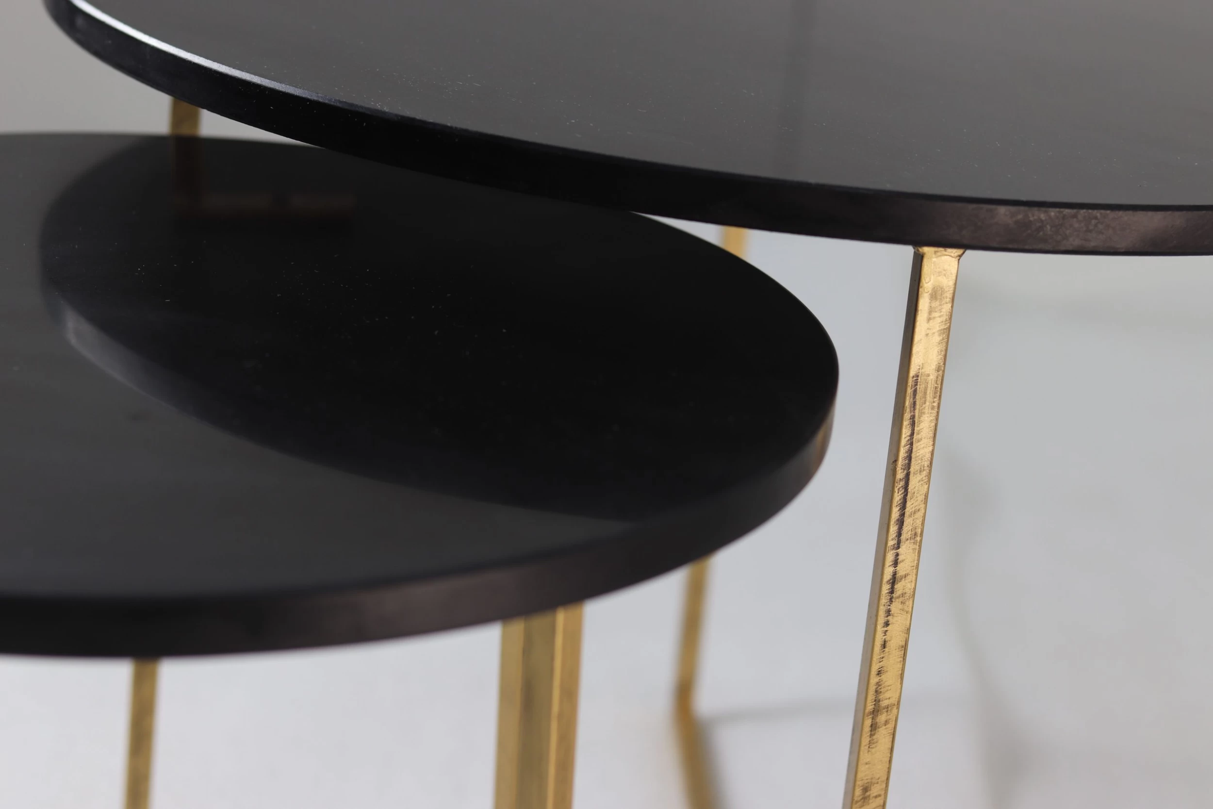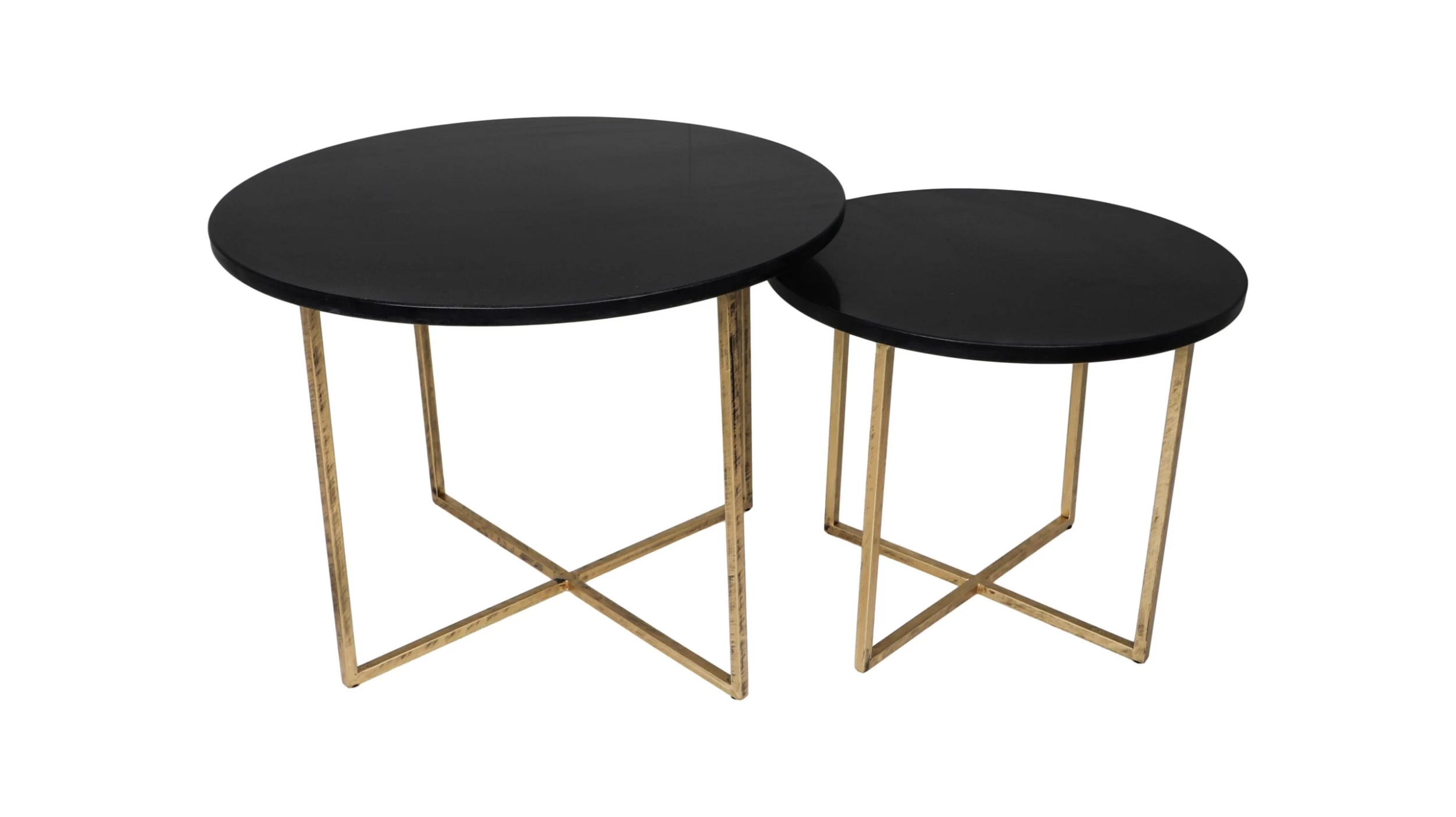 Haal een vleugje art deco in huis met deze set van 2 salontafels Gatsby. Het zwarte marmer tafelblad en de goudkleurige metalen poten zorgen voor een glamoureuze look. De kleine tafel heeft een diameter van 46cm en een hoogte van 39cm. De grote tafel een diameter van 61cm en een hoogte van 45cm. Je kan de tafels samen zetten, of apart van elkaar gebruiken.