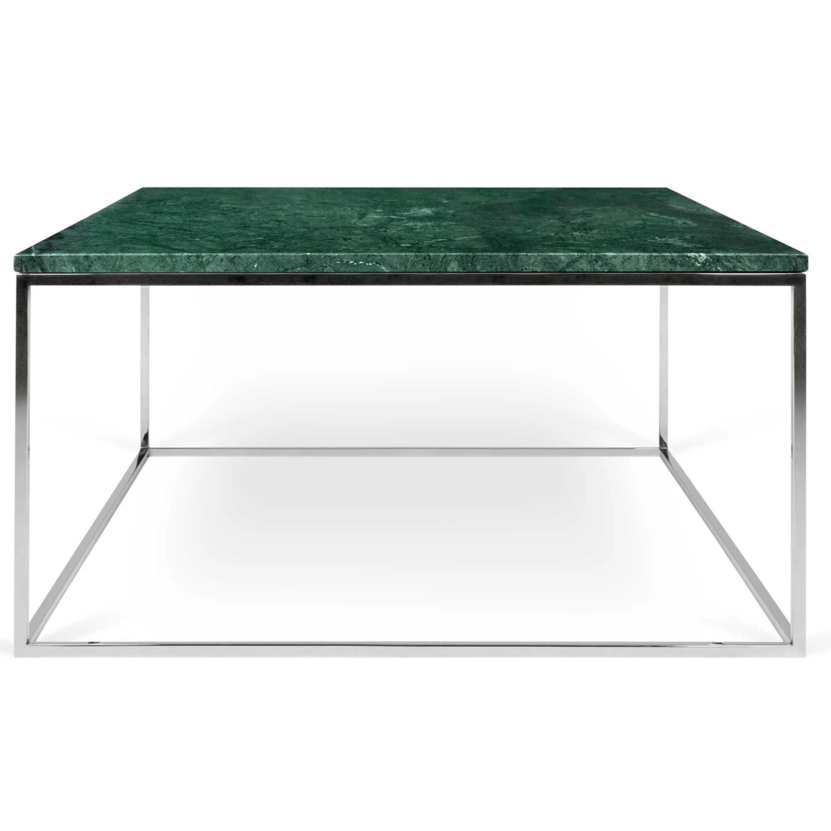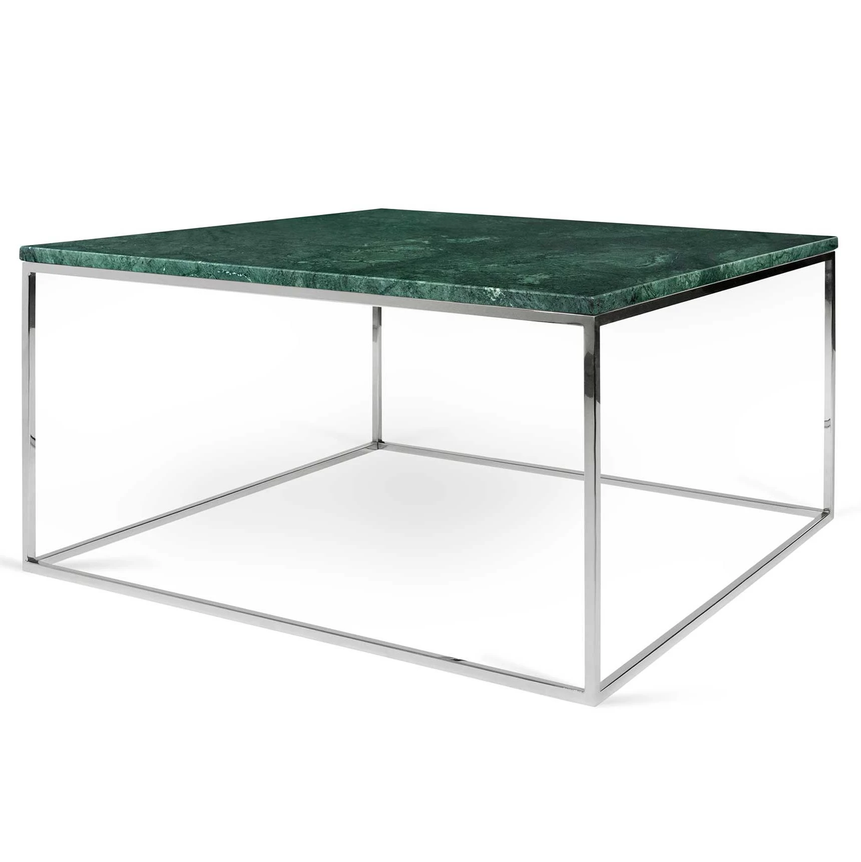 Vierkante salontafel Gleam met tafelblad van groen marmer en onderstel van verchroomd staal.gr