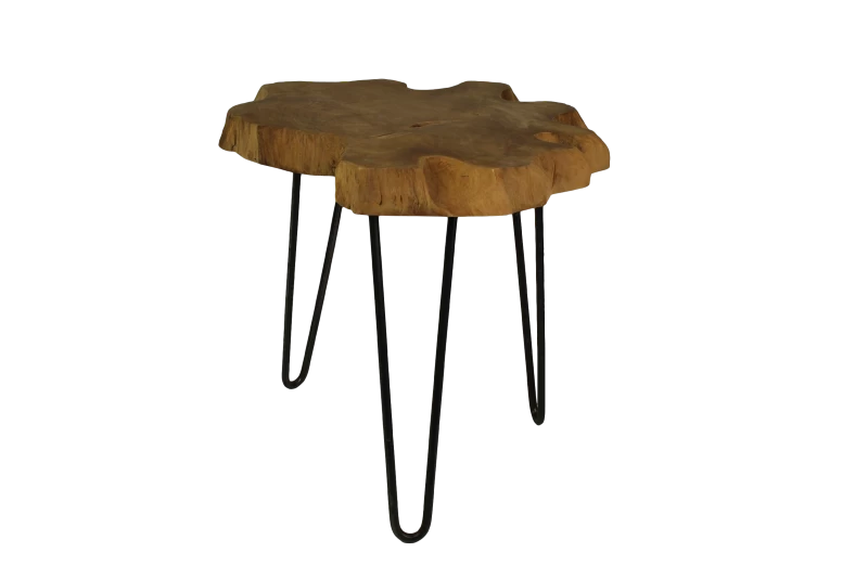 Dit leuke salontafeltje, dat ook als bijzettafel kan dienen, valt op door zijn natuurlijke vormen en combinatie van verschillende materialen. De drie hairpinpoten in V-Vorm zorgen voor een stevig en stoer onderstel, het teakhout geeft op zijn beurt een solide tafelblad. Deze Harvey-salontafel met robuuste uitstraling is een musthave voor elke landelijke woonkamer. De natuurlijke houtvormen zijn tijdens het productieproces mooi bewaard gebleven, waardoor je je onmiddellijk waant in de blokhut van een Franse houthakker.