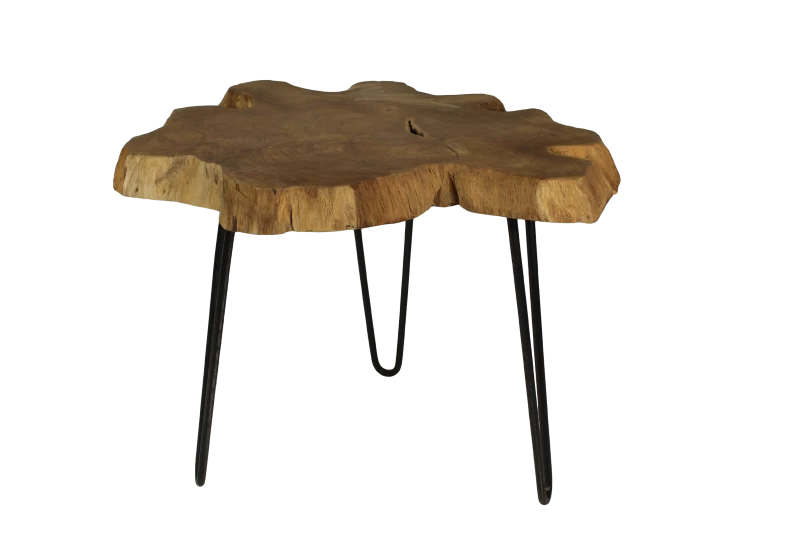 Salontafel Harvey, gemaakt uit 3 ijzeren poten in de vorm van een haarspeld en een robuust tafelblad in teakhout.