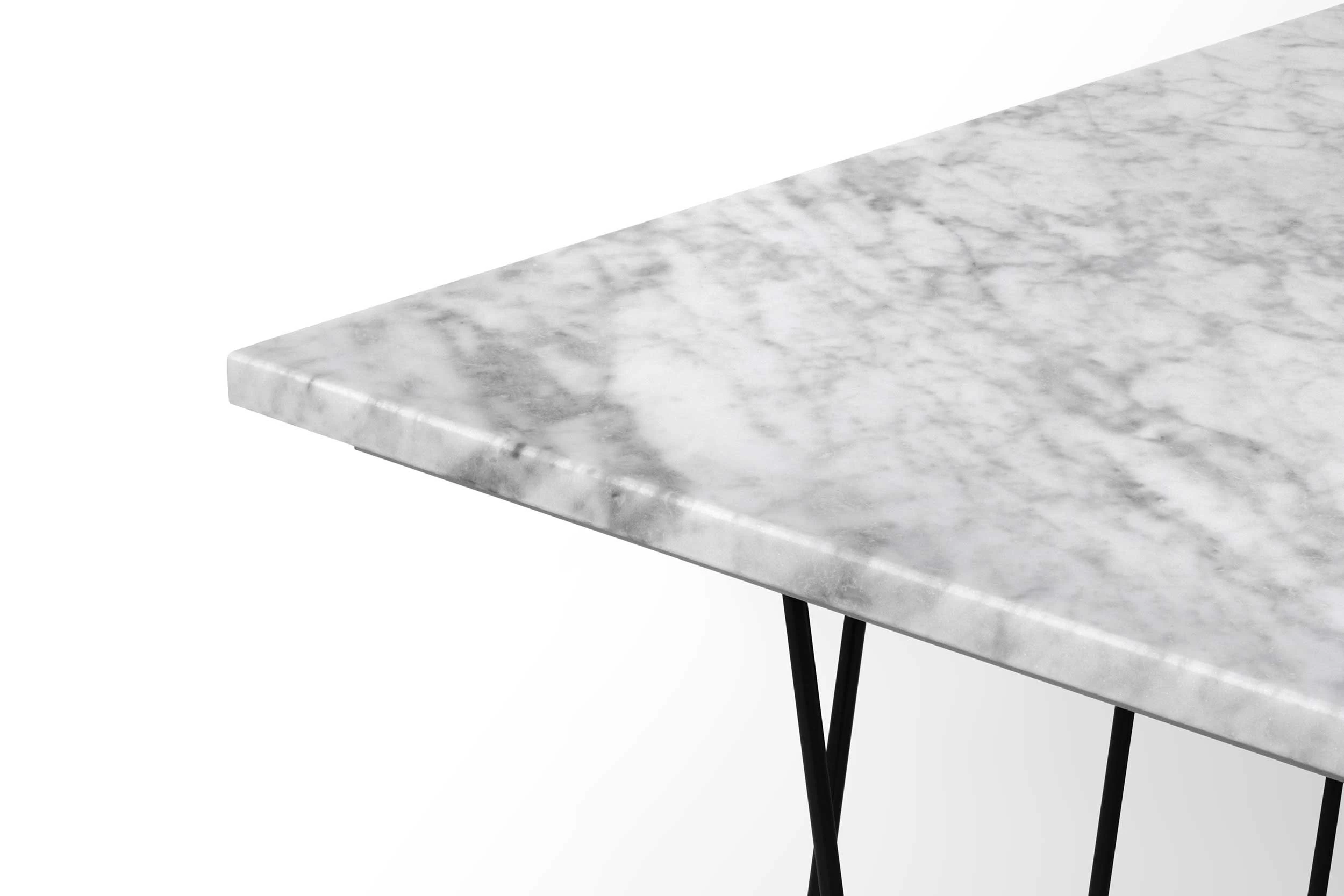 Salontafel Helix met zwart stalen frame en tafelblad van wit marmer.