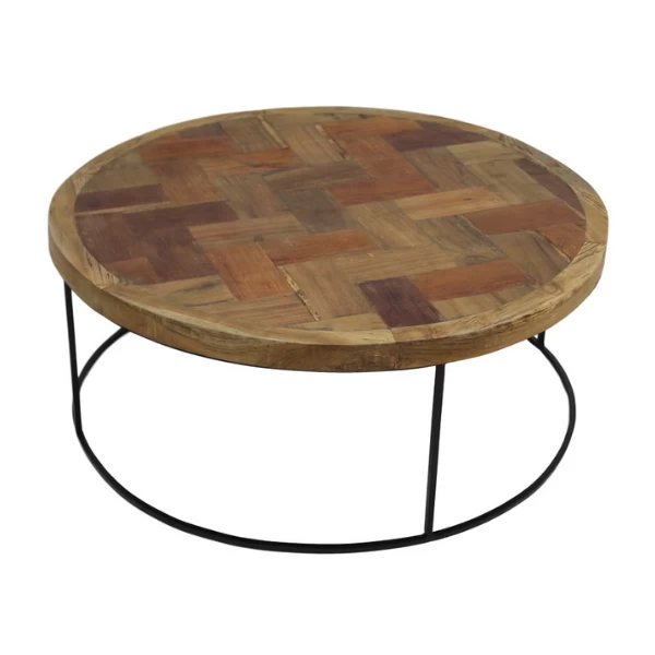 Ronde salontafel Maher, gemaakt uit een zwart onderstel en een tafelblad in teakhout met mozaïekpatroon.