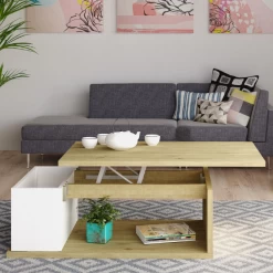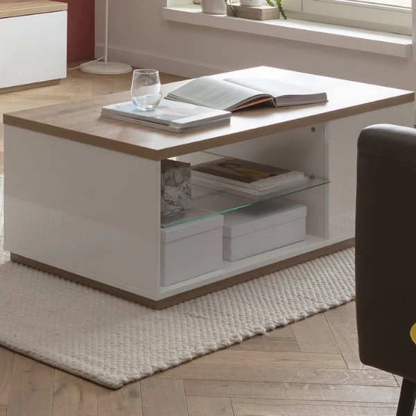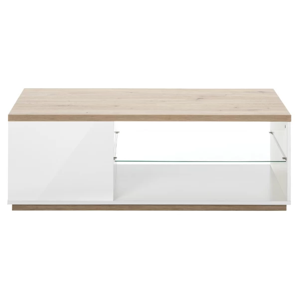 Salontafel Maki 123x59x43cm uit spaanplaat met afwerking in eikdecor en hoogglans wit. Met twee open opbergvakken en glazen legplank.