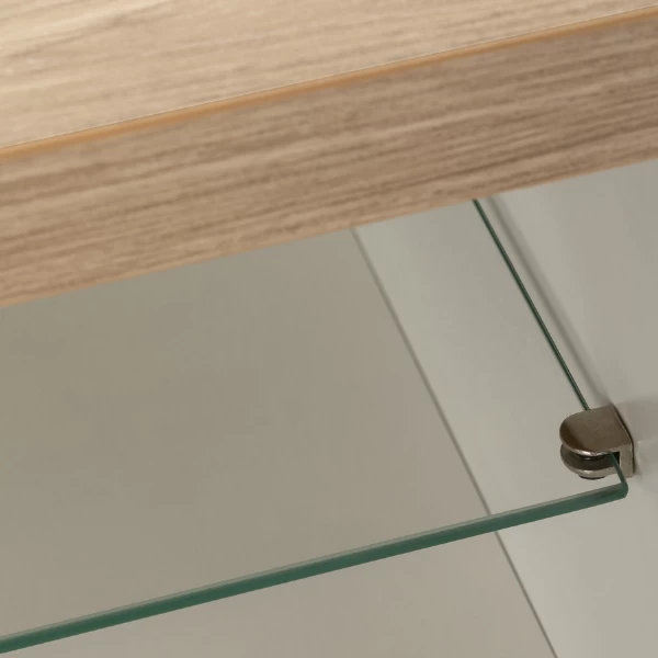 De collectie Maki staat voor moderne meubels met een Scandinavisch tintje. Deze salontafel is gemaakt uit gerecycleerd spaanplaat met afwerking in melamine. Het eikdecor zorgt voor een warme touch en contrasteert mooi met het hoogglans wit. Het tafelblad is ruim genoeg voor je favoriete boeken of magazines, en drankjes en hapjes voor je genodigden. Aan de zijkant zijn twee open opbergvakken voorzien waar je spullen kan bewaren die anders in de woonkamer rondslingeren. De glazen legplank zorgt niet alleen voor een moderne touch, maar biedt ook nog extra opbergruimte. Ontdek de volledige woonkamercollectie Maki op onze site.