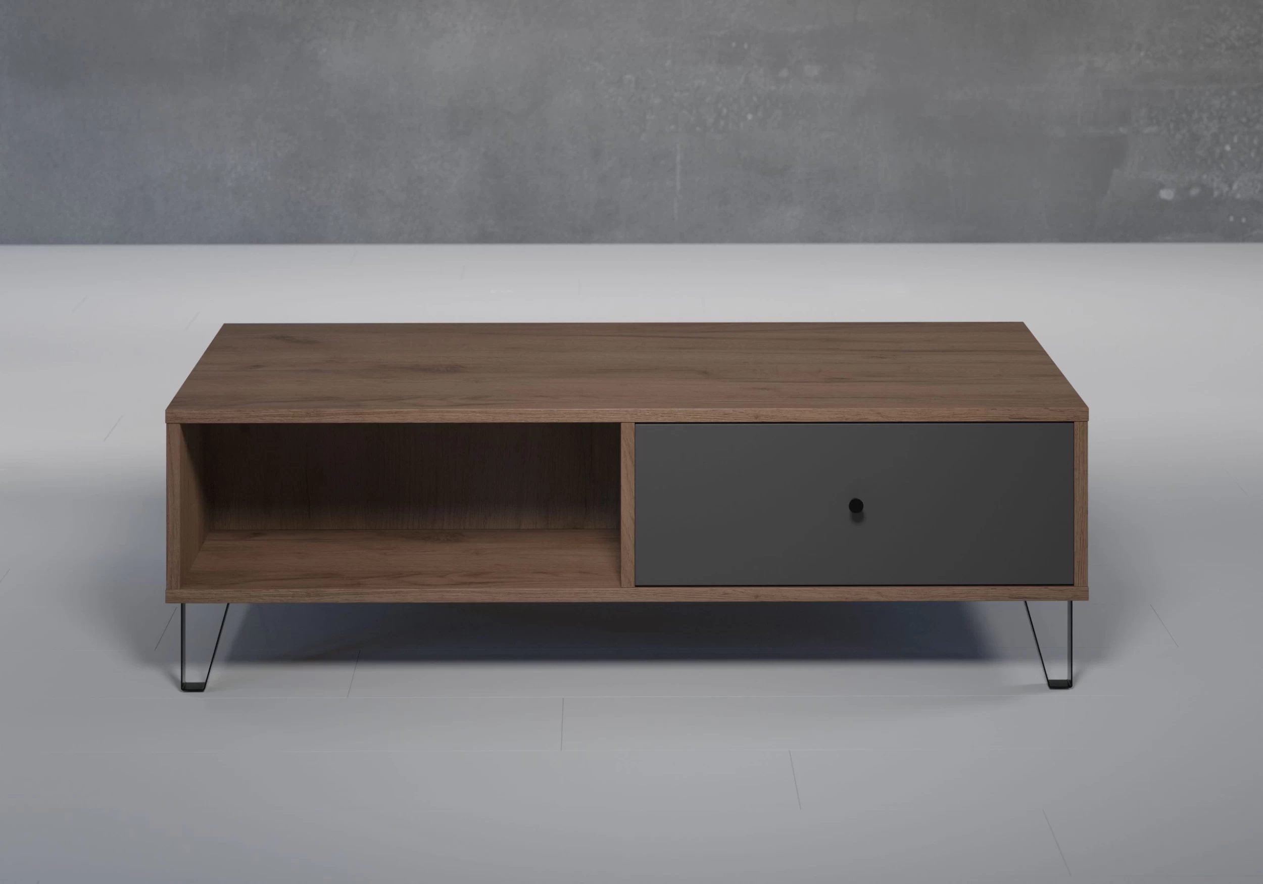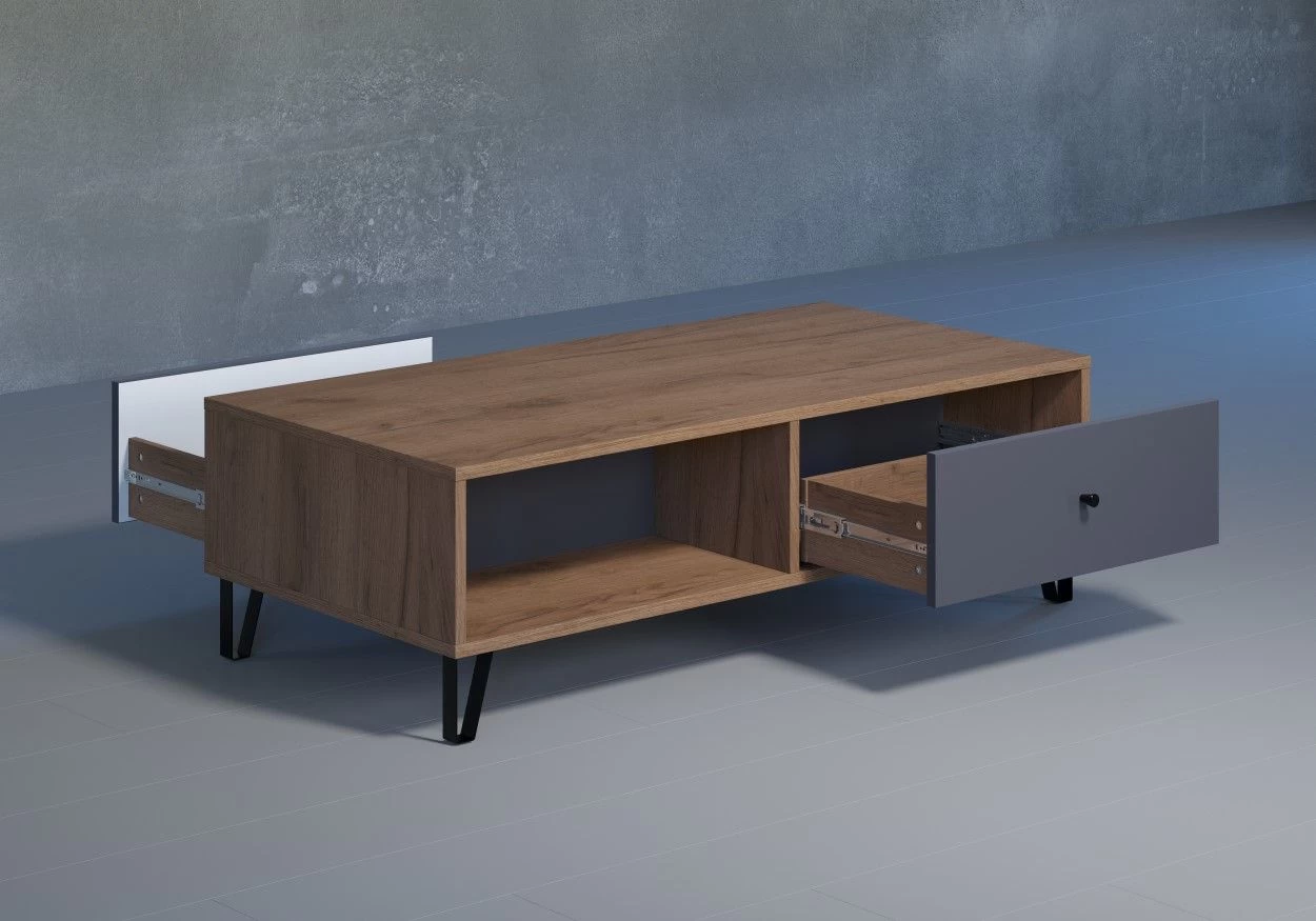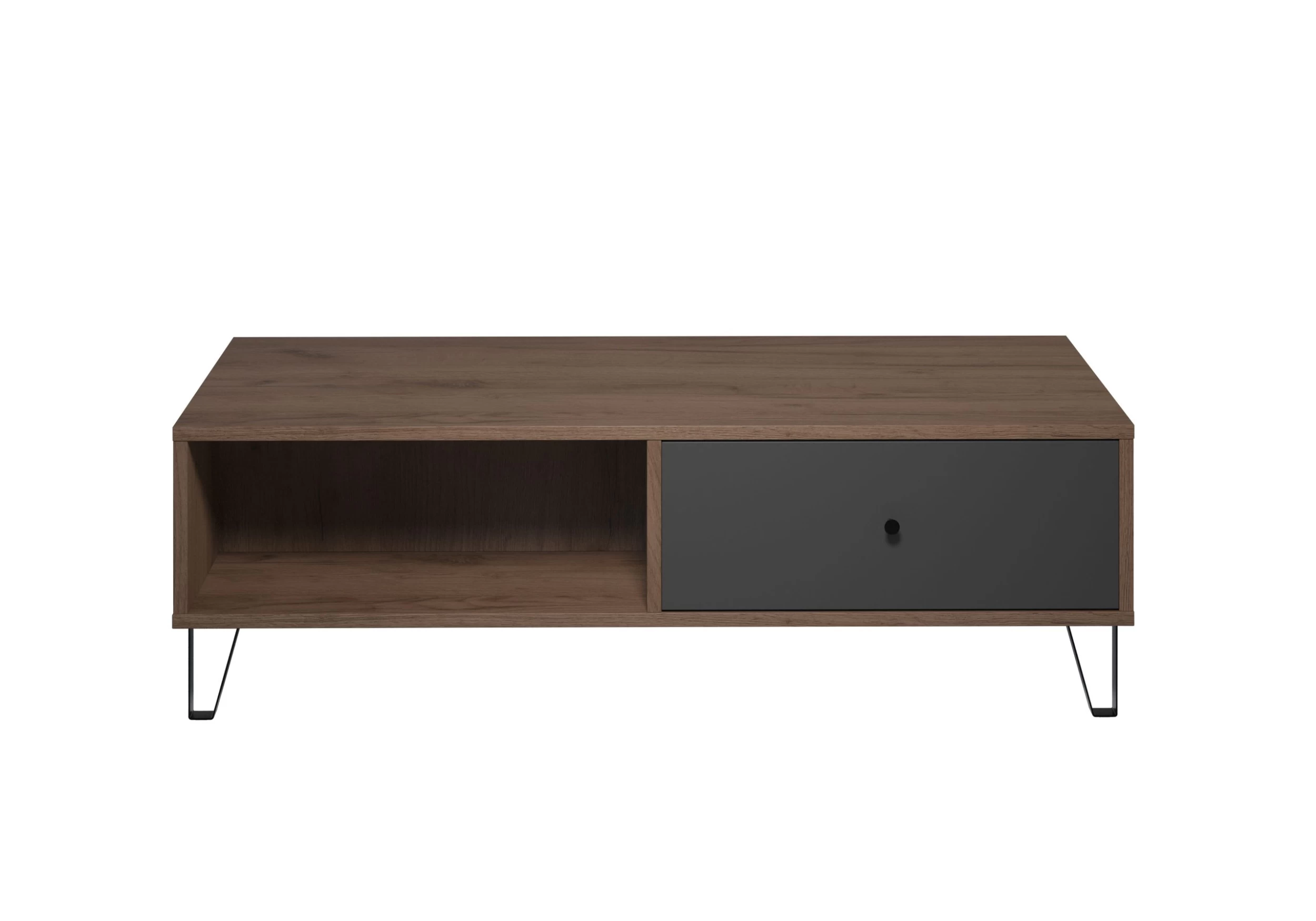 Met een romp in eiken Craft Oak-decor en een decoratieve diepgetrokken voorkant straalt dit salontafel een eigentijdse esthetiek uit. De zwartgekleurde handgrepen voegen een vleugje elegantie toe aan het algehele ontwerp.