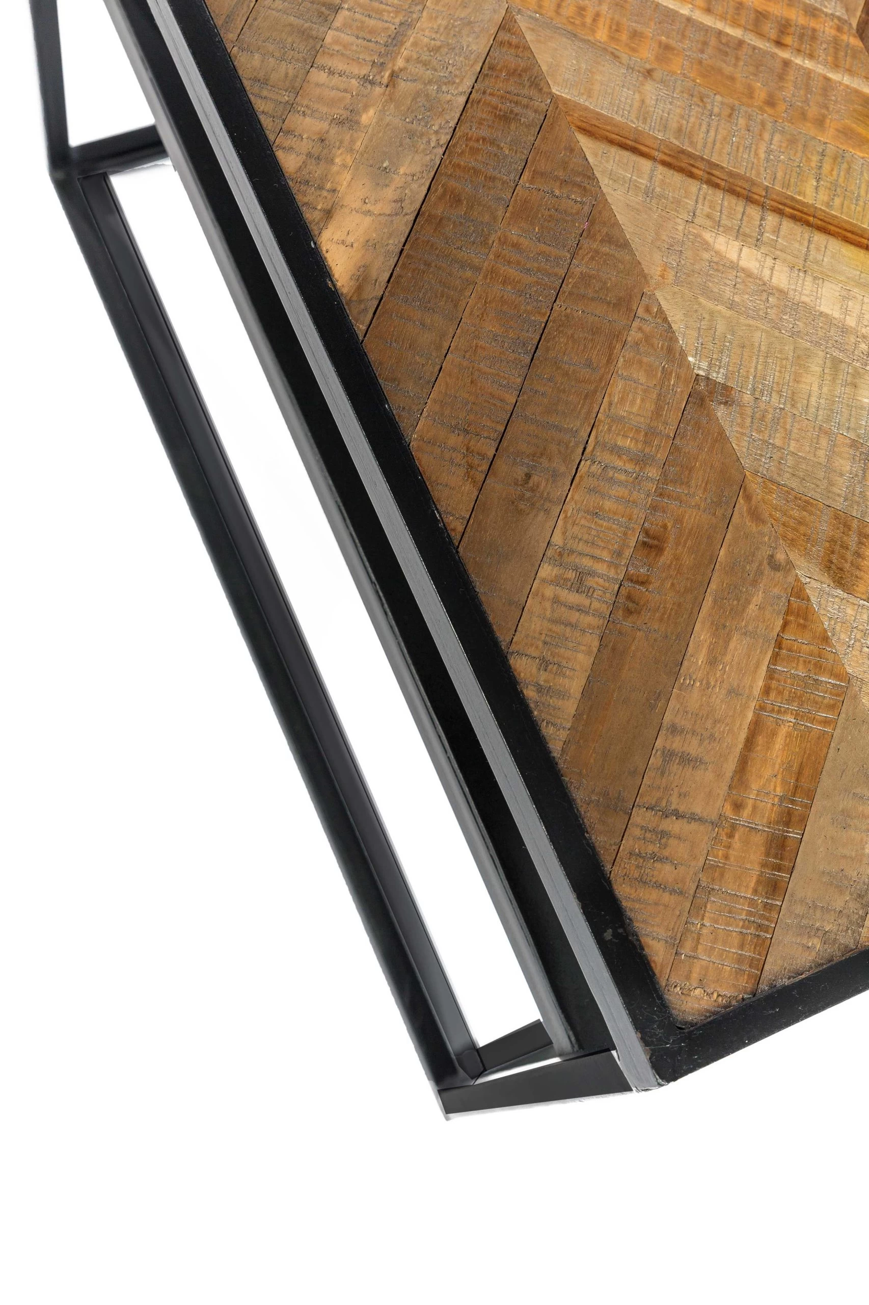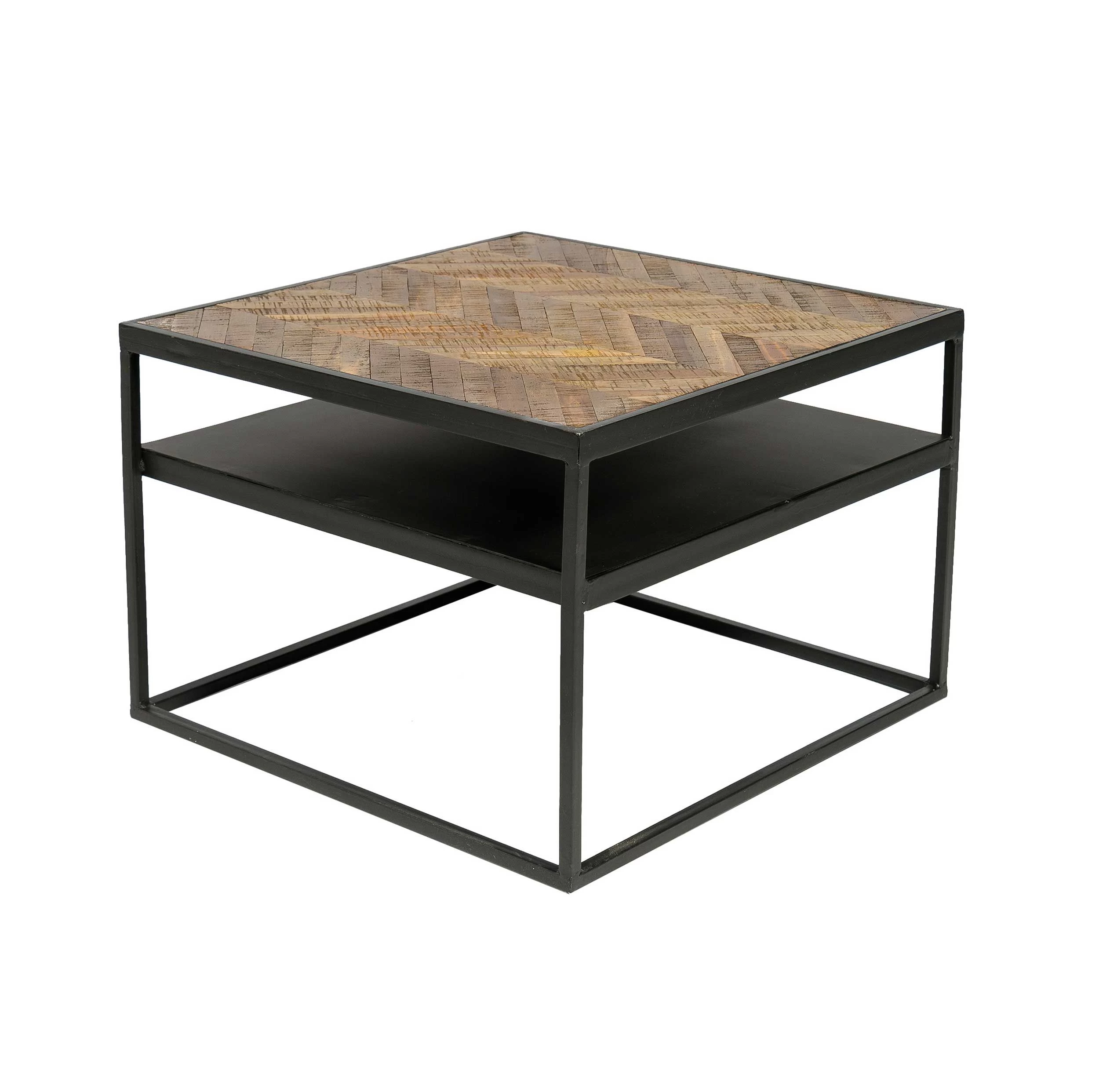 Salontafel Morena, gemaakt uit zwarte staal met een tafelblad uit massief teakhout. Meet 60 cm lang op 60 cm breed en 40 cm hoog.