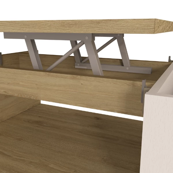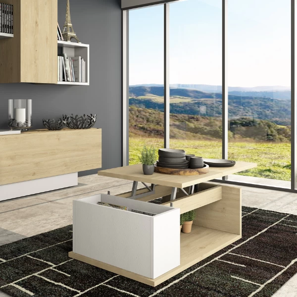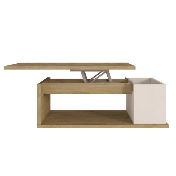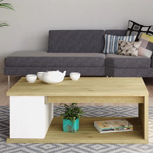 Salontafel Otawa heeft een eenvoudig, maar vernuftig design. Je kan het tafelblad immers naar jou toe trekken en gebruiken als plateau. Wanneer je het tafelblad uittrekt, zal je merken dat je het witte gedeelte ook als opbergvak kan gebruiken. Handig, niet?