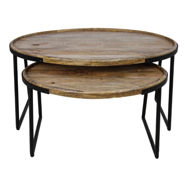 Set van 2 salontafels Paulson. Met een tafelblad in mangohout en een zwart metalen onderstel.Β