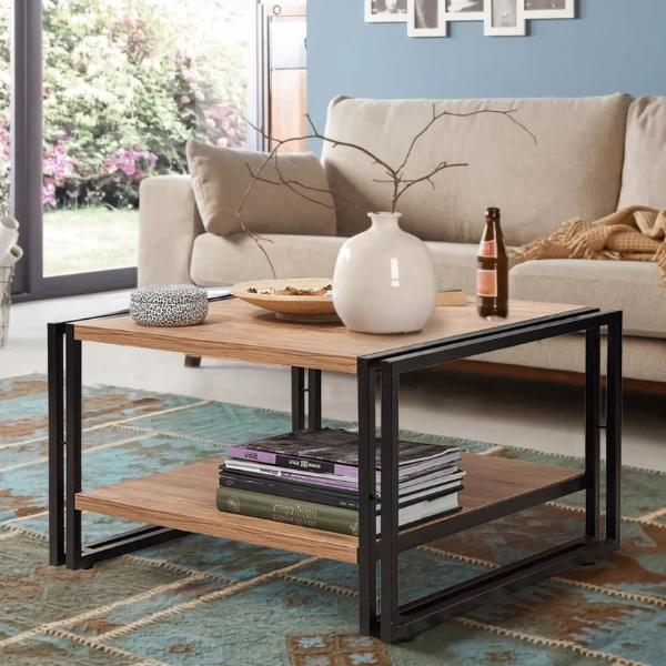 Salontafel Rani is gemaakt uit gemelamineerde spaanplaat met decor van Atlantische pijnboom. Het frame is uit zwart metaal.