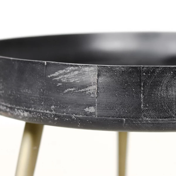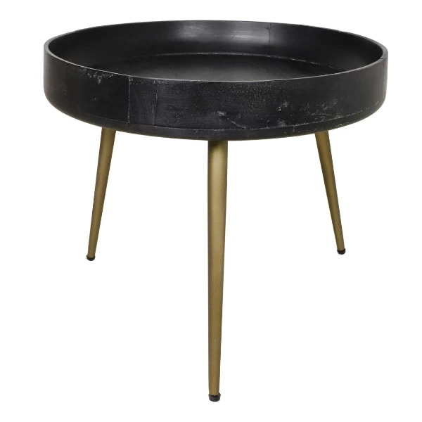 Salontafel Ventura, beschikt over een diameter van 50 cm. Gemaakt uit mangohout met goudkleurige metalen poten.