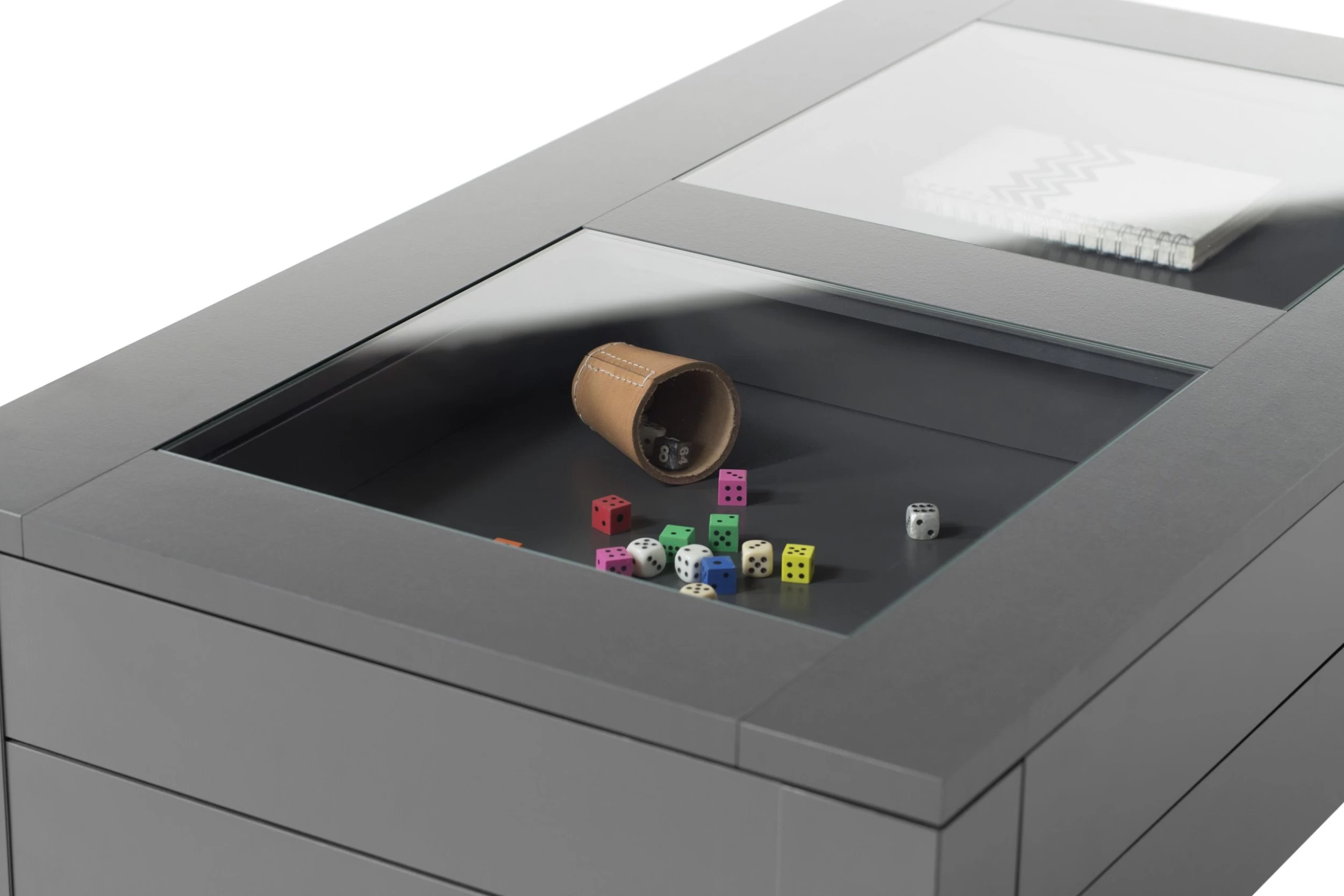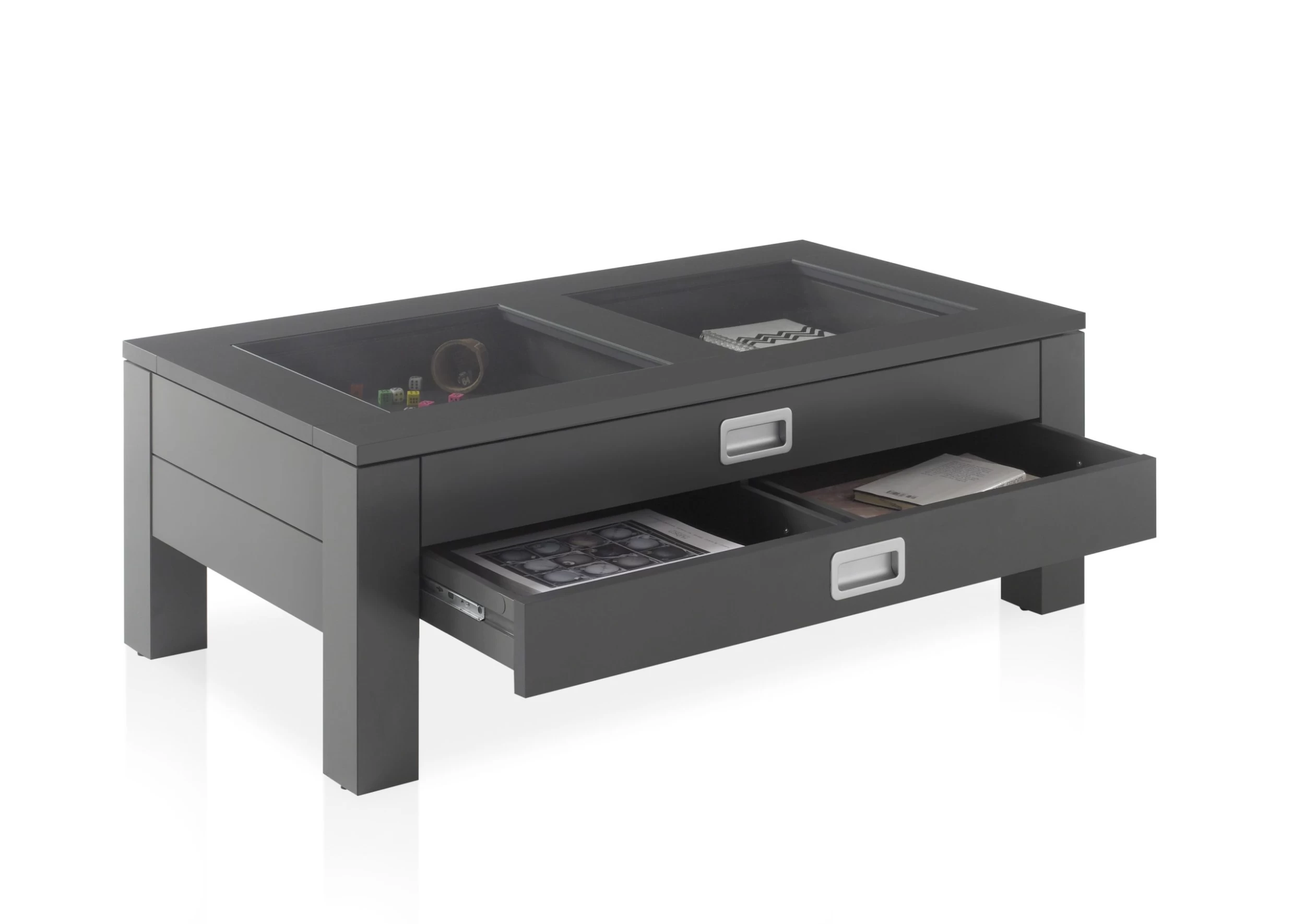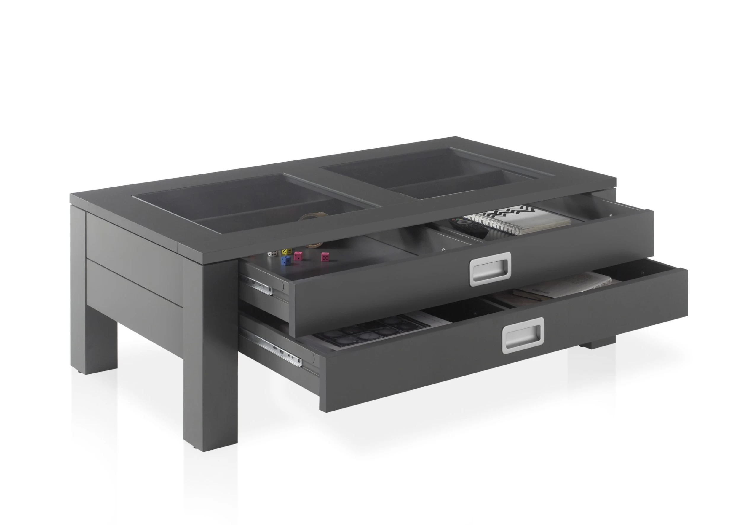 Donkergrijze salontafel Yadran met 2 lades, gemaakt uit MDF en spaanplaat, met 2-ledig tafelblad in glas.