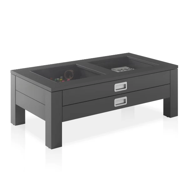 Dit donkergrijze salontafelmeubel is perfect voor de verzamelaar die zijn favoriete spullen in het zicht wil hebben, aangezien het tafelblad is samengesteld uit twee inlegbladen in helder glas. Maar evengoed kan je een tijdschrift of je afstandsbediening netjes opbergen in een van de twee lades, die zijn uitgerust met metalen handgrepen. De stevige poten in MDF zorgen voor de noodzakelijke stabiliteit. Het tafeltje kan tot wel 30 kg belast worden. Een leuk salontafel voor wie eens wat anders wil in de woonkamer!