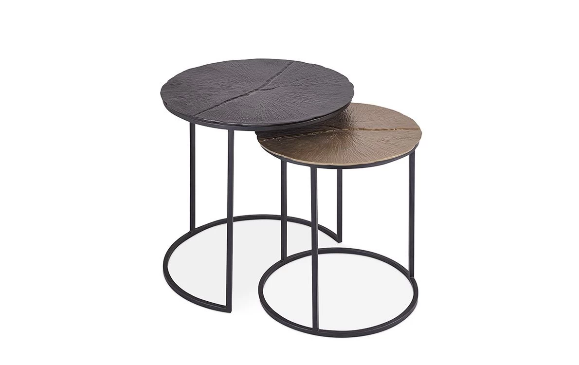 Set van 2 ronde salontafels Margriet, gemaakt van metaal. Kunnen apart of in elkaar geschoven worden. Brons/zwart.