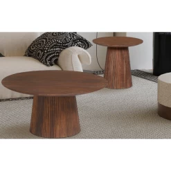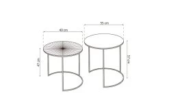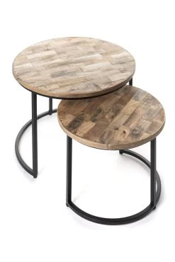Deze set bestaat uit 3 ronde bijzettafels met verschillende afmetingen die je ook onafhankelijk van elkaar kan gebruiken. Om plaats te besparen wanneer je ze niet nodig hebt, kan je de tafels ook onder elkaar schuiven.