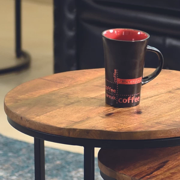 Ben je op zoek naar een salontafel met een industriële look voor jouw woonkamer? Ga voor deze originele set van het Belgische merk Rousseau. De set is opgebouwd uit drie ronde salontafels met robuuste bladen uit zwart magnoliahout. De twee grotere tafels hebben een halfrond onderstel uit donkerkleurig metaal, het kleinste tafeltje heeft een volledig rond onderstel. De verschillende onderstellen en de afmetingen van de tafeltjes maken het mogelijk om ze onder elkaar te schuiven zoals op de foto.