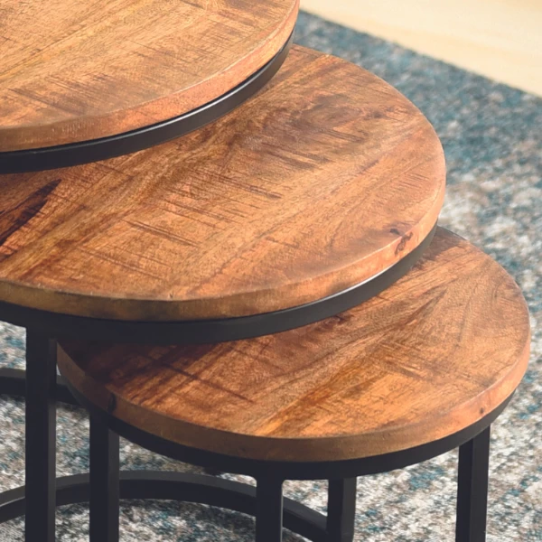 Drie salontafeltjes Amana hebben een metalen onderstel en een blad uit magnoliahout.