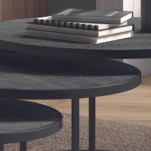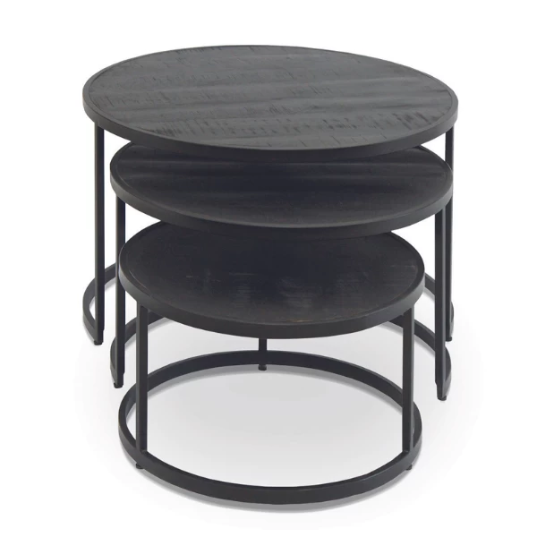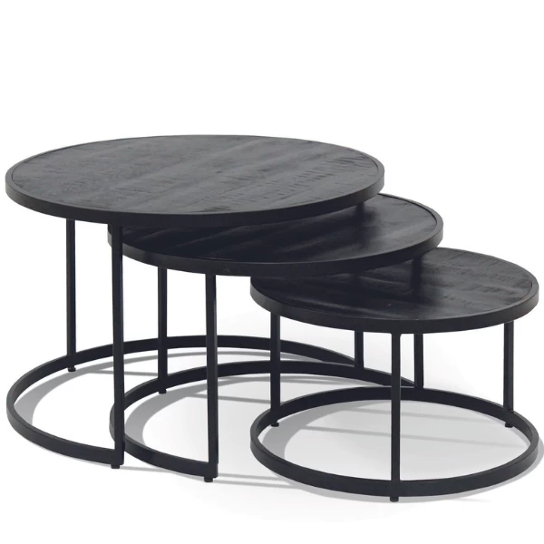 Drie salontafeltjes Amana hebben een metalen onderstel en een blad uit zwart magnoliahout.