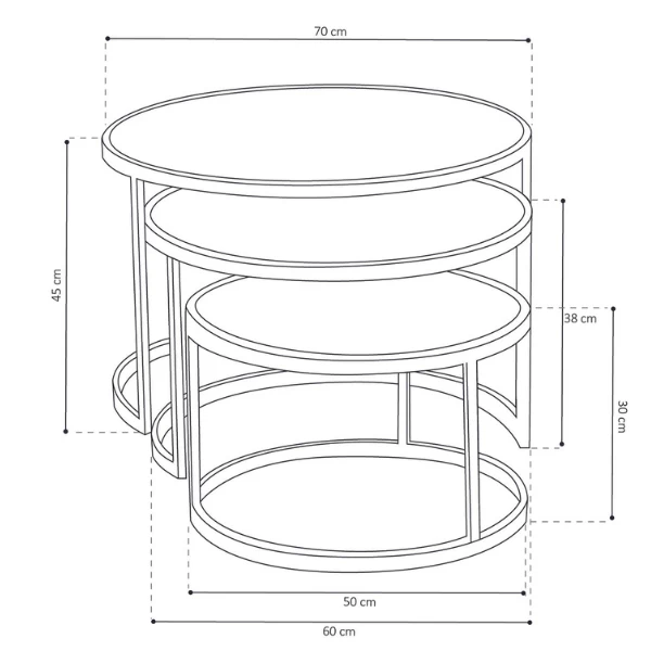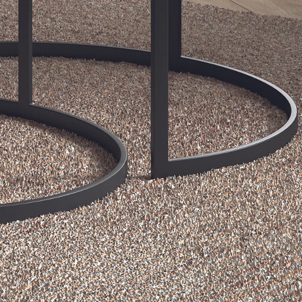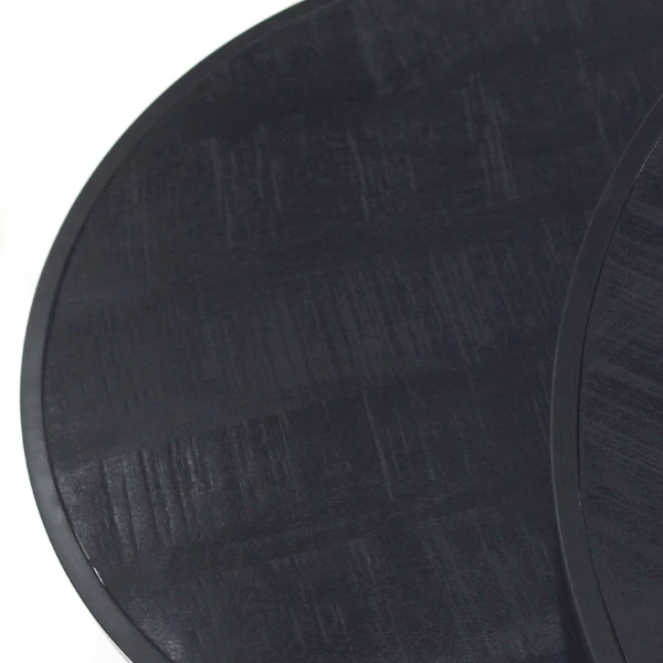 Ben je op zoek naar een salontafel met een industriële look voor jouw woonkamer? Ga voor deze originele set van het Belgische merk Rousseau. De set is opgebouwd uit drie ronde salontafels met robuuste bladen uit zwart magnoliahout. De twee grotere tafels hebben een halfrond onderstel uit donkerkleurig metaal, het kleinste tafeltje heeft een volledig rond onderstel. De verschillende onderstellen en de afmetingen van de tafeltjes maken het mogelijk om ze onder elkaar te schuiven zoals op de foto.