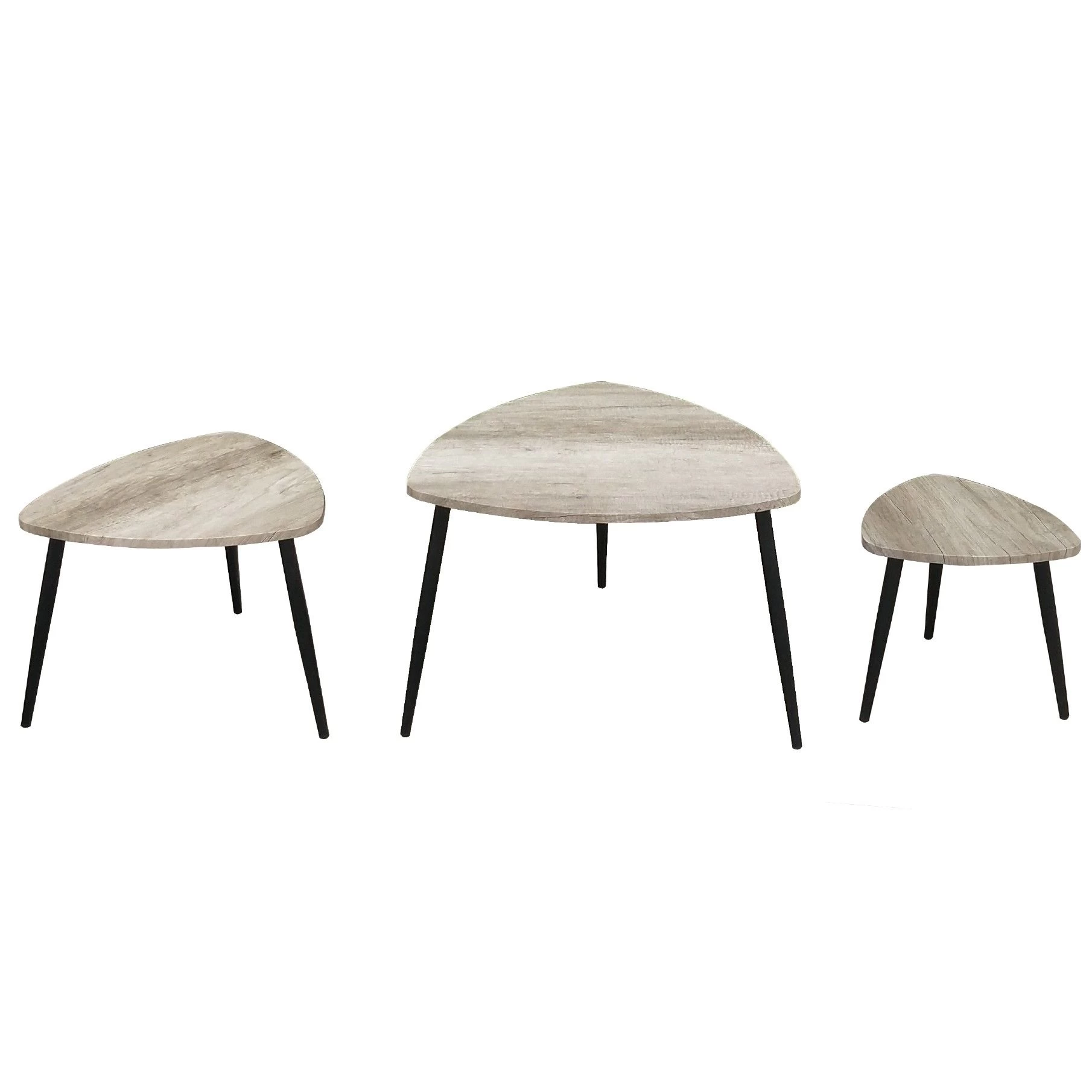 Deze set van drie moderne salontafeltjes heeft heel wat moois te bieden. Op functioneel vlak in de eerste plaats, aangezien de drie verschillende groottes het mogelijk maken tal van combinaties op poten te zetten. Wil je ze in set gebruiken of allemaal apart? Alles is mogelijk, vermits je ze eenvoudig in en uit elkaar kan schuiven. In de tweede plaats ogen de tafeltjes ook goed, door de combinatie van licht en donker. De tafels zijn gemaakt uit MDF in een grijzige houtkleur, pvc en metaalbuisjes.