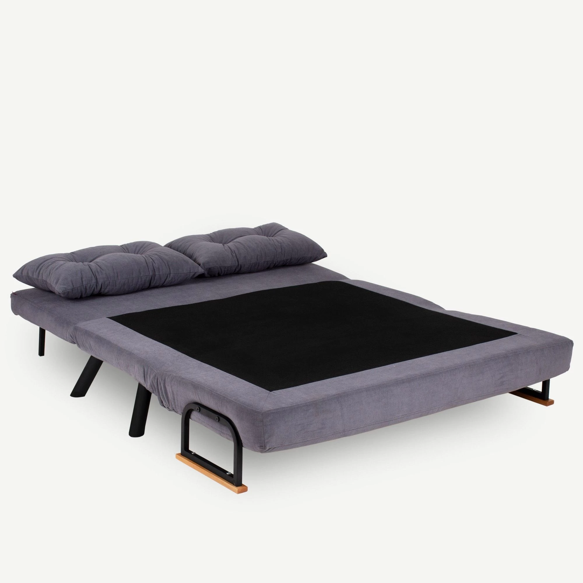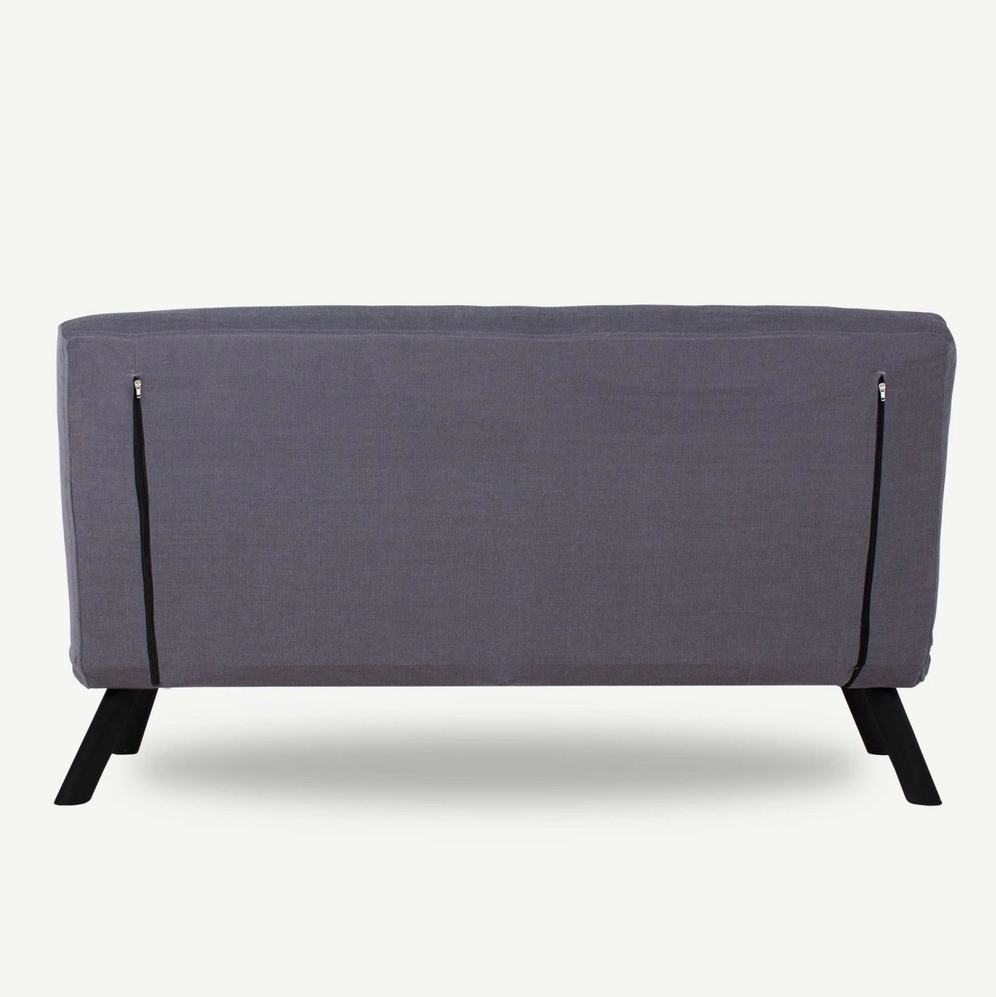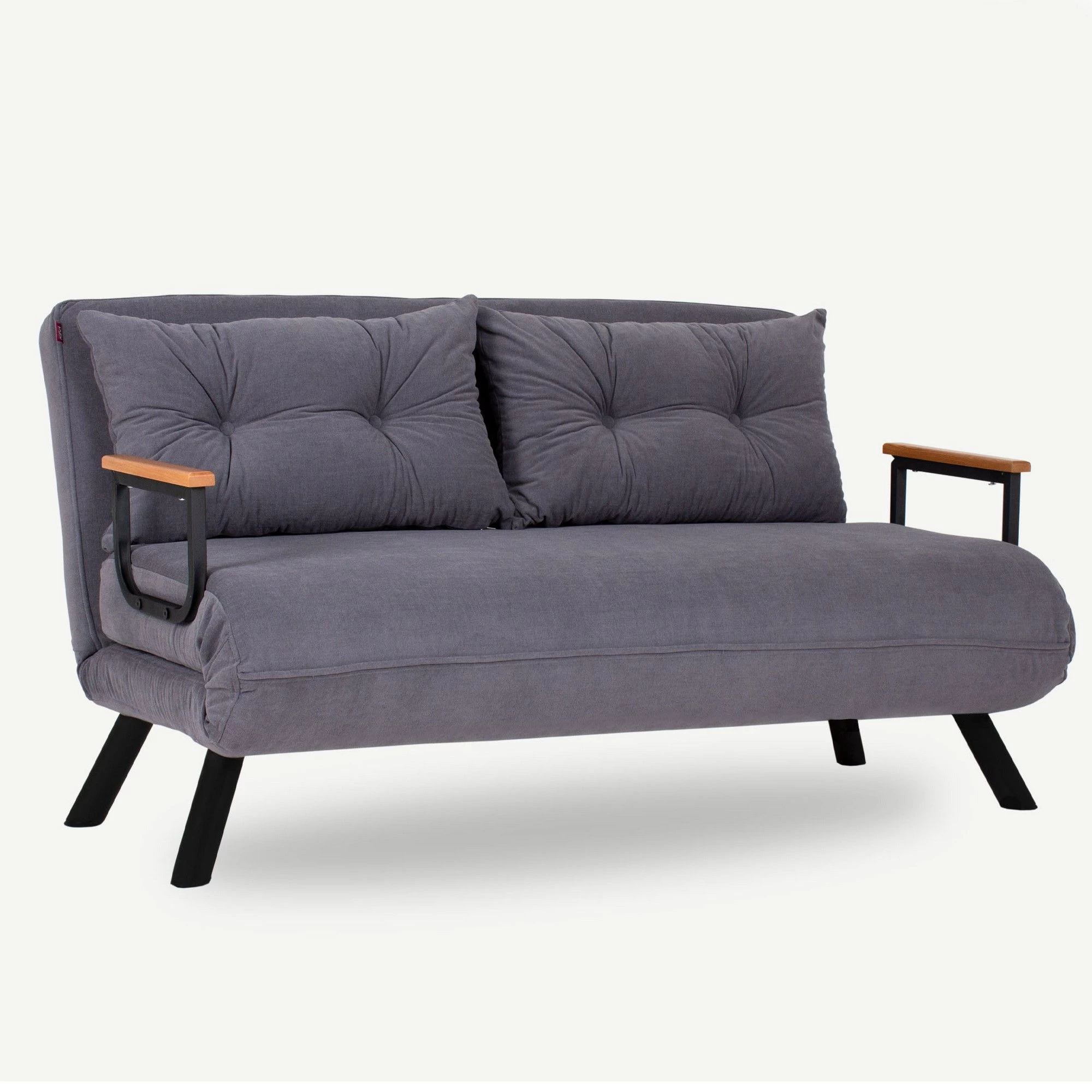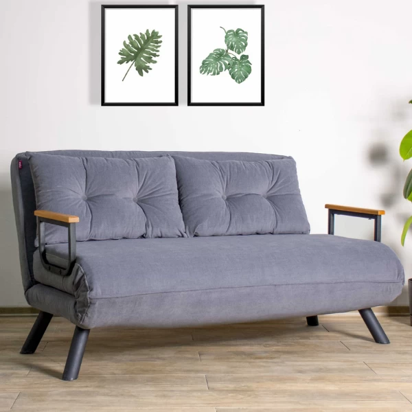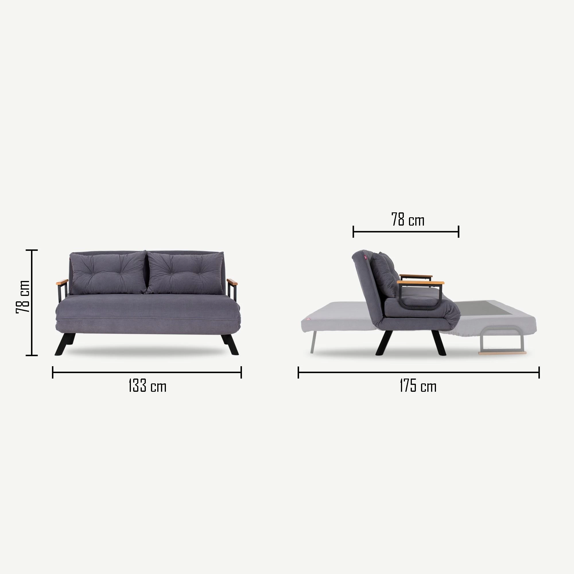 Deze stijlvolle grijze slaapbank past mooi binnen uw retro interieur. Het zwarte metaal van het frame in combinatie met de warme houten accenten van de armleuning vormen een mooi geheel. Het handige aan deze zetel is dat hij in een handomdraai kan omgetoverd worden tot een tweepersoonsbed wat altijd goed uitkomt als u onverwachtse logés heeft.
