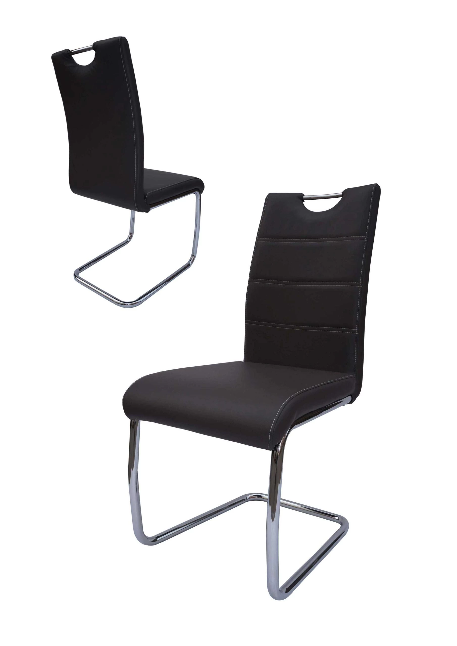 De Elite sledestoel heeft een zwarte, kunstlederen bekleding en is uitgerust met een handgreep. De rugleuning van deze moderne stoel is versierd met horizontale stiksels.