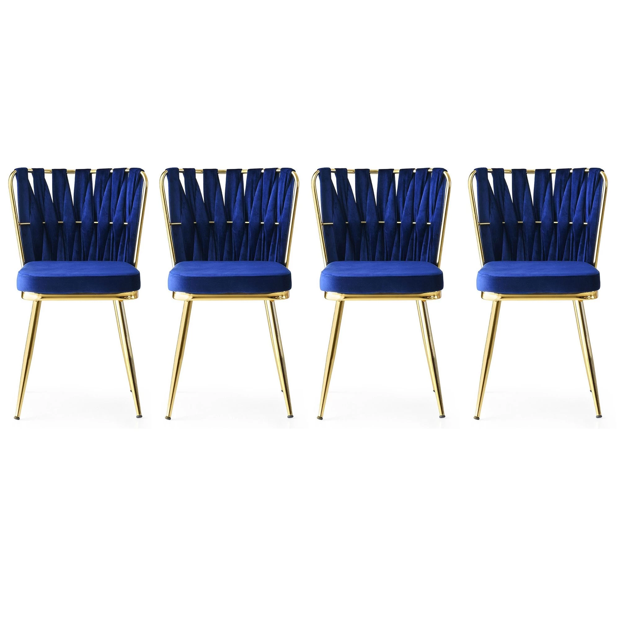 Voeg een vleugje stijl en comfort toe aan je zitmeubel met deze 4-delige stoelenset. De set is gemaakt van een 100% metalen frame en fluwelen stof en heeft een modern en uniek ontwerp. Met een breedte van 43 cm en een hoogte van 82 cm is deze stoelenset perfect voor elke kamer. Hij heeft een draagvermogen van 175kg en elke stoel weegt 5,7kg. De prachtige goud marineblauwe kleur zal echt opvallen in je huis.