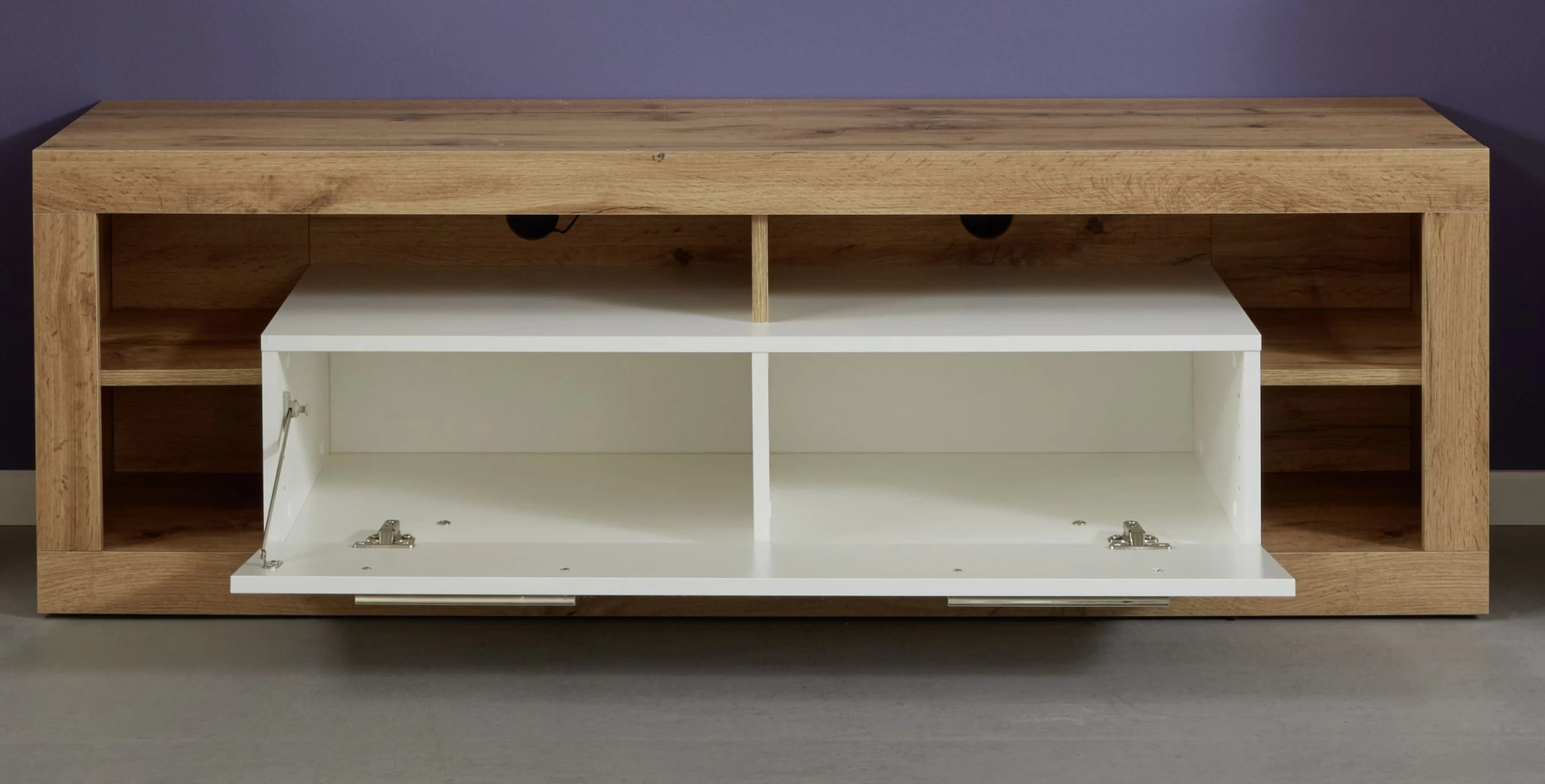 Met een romp in ‘Wotan’-eiken en een wit decor voegt het tv-meubel een vleugje elegantie toe aan elke kamer. De voorkant heeft een decoratieve hoogglans look, waardoor het een echte blikvanger is en de algehele esthetiek van je woonruimte verbetert. De chroomkleurige handgrepen met glanzende afwerking vullen het kleurenschema perfect aan en geven het meubel een moderne en strakke uitstraling.