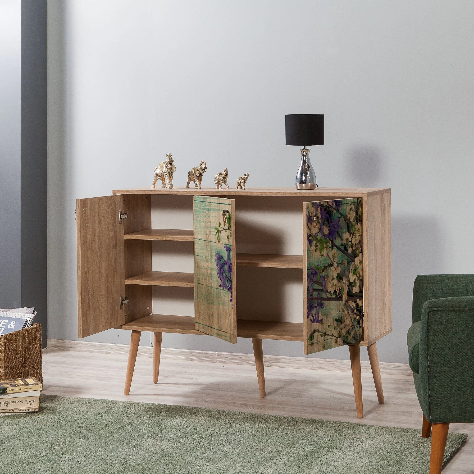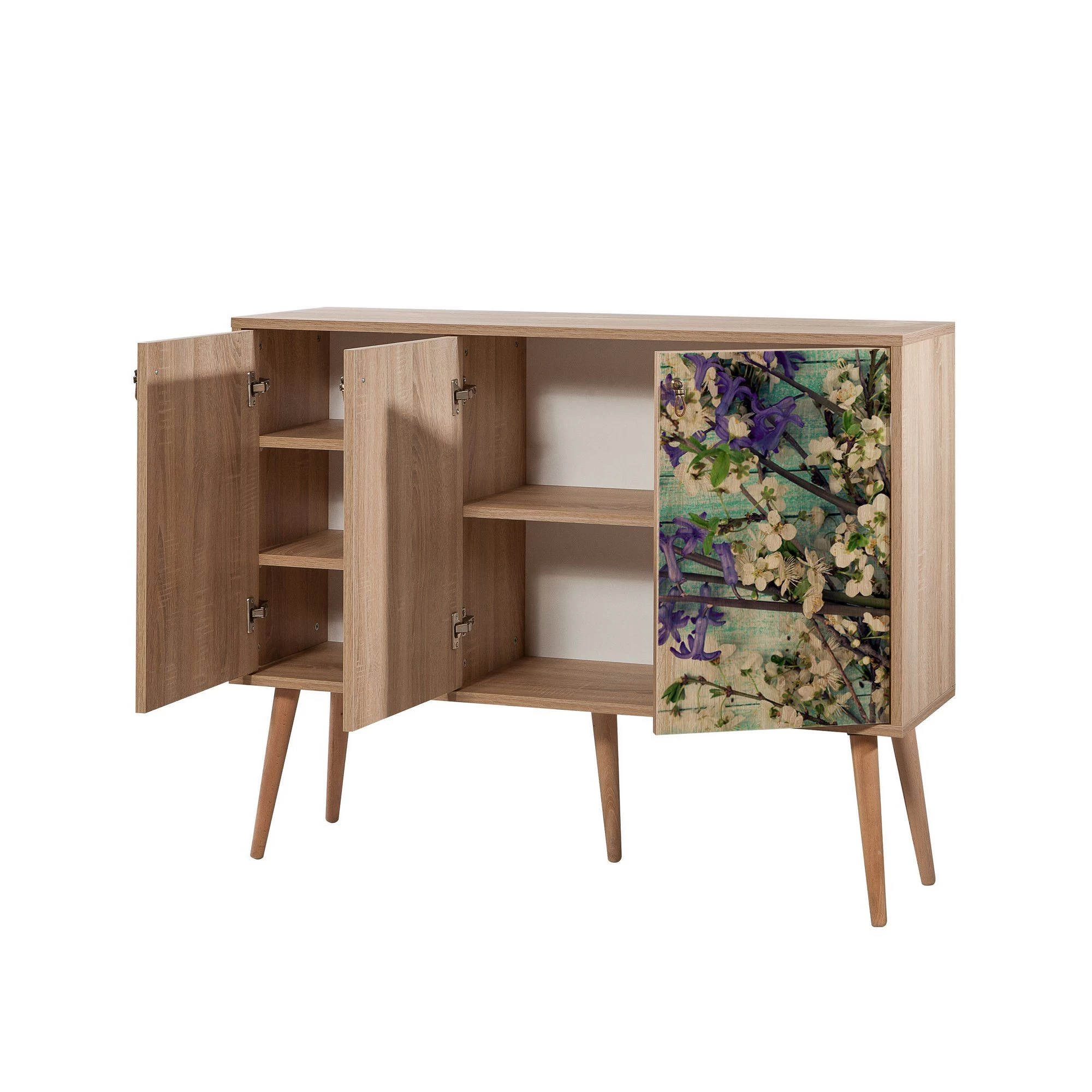 Vella Console: Een duurzaam en stijlvol meubelstuk gemaakt van 100% gemelamineerd spaanplaat. Met haagbeukenpoten, handgrepen van metaal en touw en een UV-coating. Afmetingen: 120cm breed, 90cm hoog, 36cm diep. Komt in Sonoma Eik kleur
