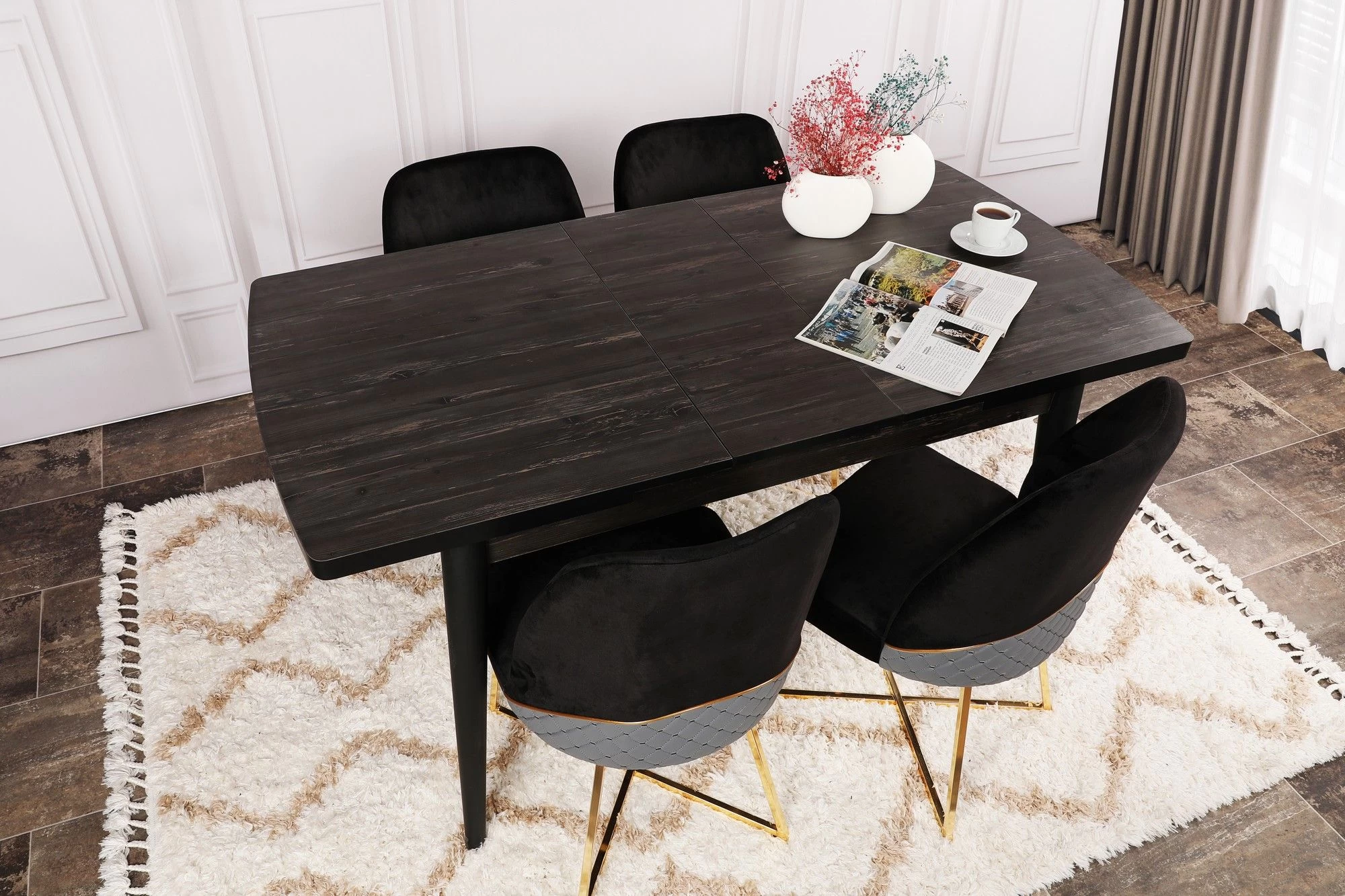 De Vella eettafel is verkrijgbaar in een strakke zwarte kleur en voegt een modern tintje toe aan elke eetkamer of keukeninrichting. De zwarte kleur is veelzijdig en kan gemakkelijk worden gecombineerd met een breed scala aan stoelstijlen en -kleuren, zodat je een aangepaste look kunt creëren die je persoonlijke smaak en stijl weerspiegelt.