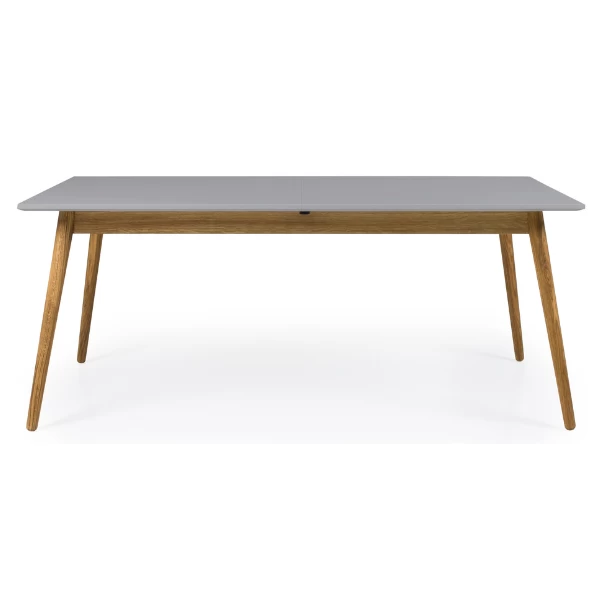Deze eettafel heeft een grijsgelakt tafelblad uit MDF en vier stevige, eikenhouten poten. Deze tafel kan een gewicht tot 50 kg dragen (gelijkmatig verdeeld). Bij deze tafel is 1 verlengstuk inbegrepen, hiermee kun je de tafel 45 cm langer maken, waardoor er plaats is voor 2 extra personen. Deze tafel is ook met eenwitgelakt tafelblad verkrijgbaar.