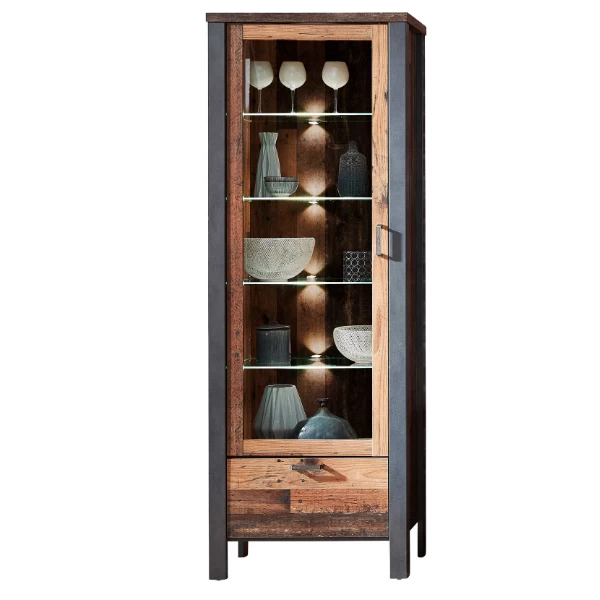 Vitrinekast Carthago 69x40x194cm uit spaanplaat met een look van oud hout. Met twee glazen deuren en één lade. Met metalen handgrepen en LED-verlichting.