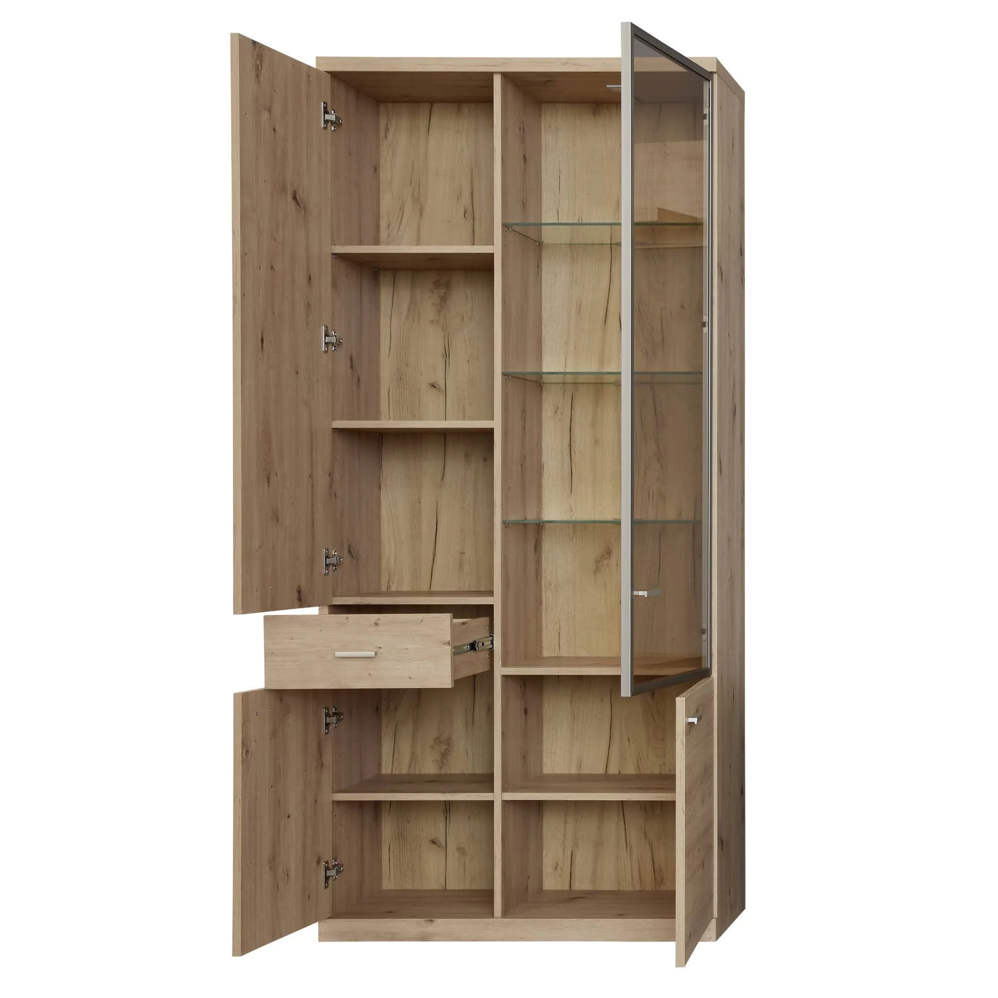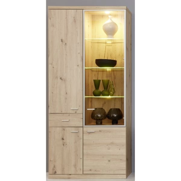 Bovendien is het ontwerp van de Echo-vitrine echt opmerkelijk. De combinatie van het Artisan Oak-decor, het Pasol glas en het aluminium frame geeft hem een verfijnde en elegante look. Hierdoor past hij perfect bij de rest van je meubels en voegt hij een vleugje stijl toe aan je ruimte.