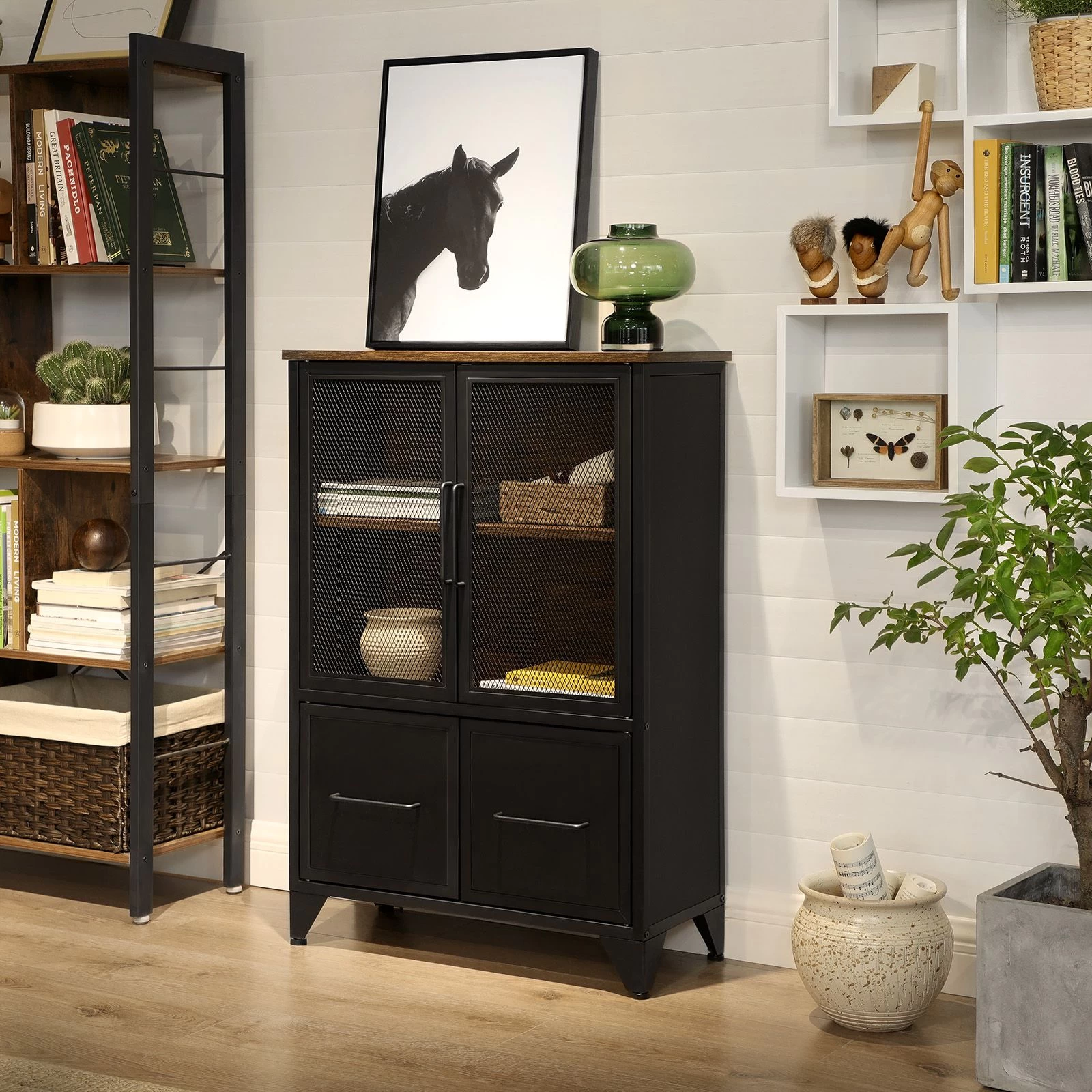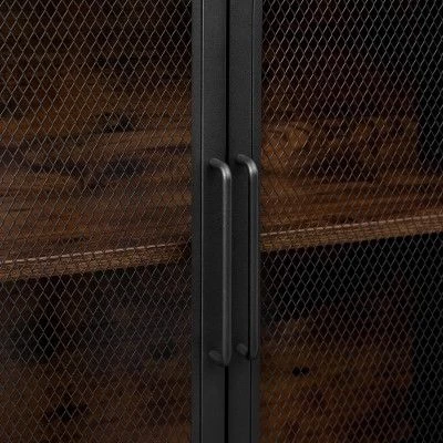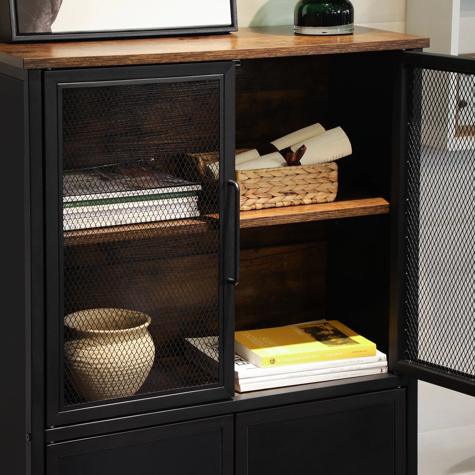De combinatie van mat zwart en rustiek bruin, de gaasdeuren, de elegante handgrepen en de tapse pootjes maken dit industriële kastje tot een echt statement piece in je woonkamer. Plaats enkele boeken, fotoalbums, decoratie… op de verstelbare legplank uit spaanplaat, je spullen zullen subtiel zichtbaar zijn door de gaasdeuren. De stalen vitrinekast is ook uitgerust met stelpootjes.