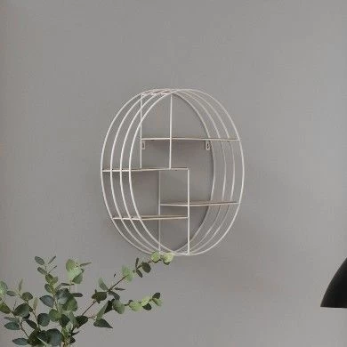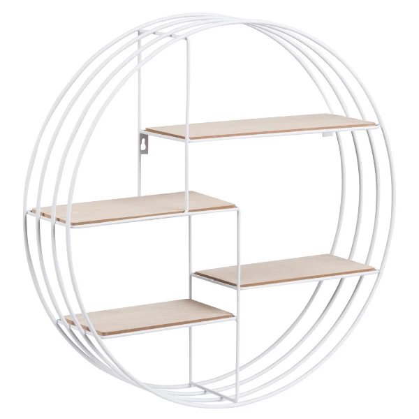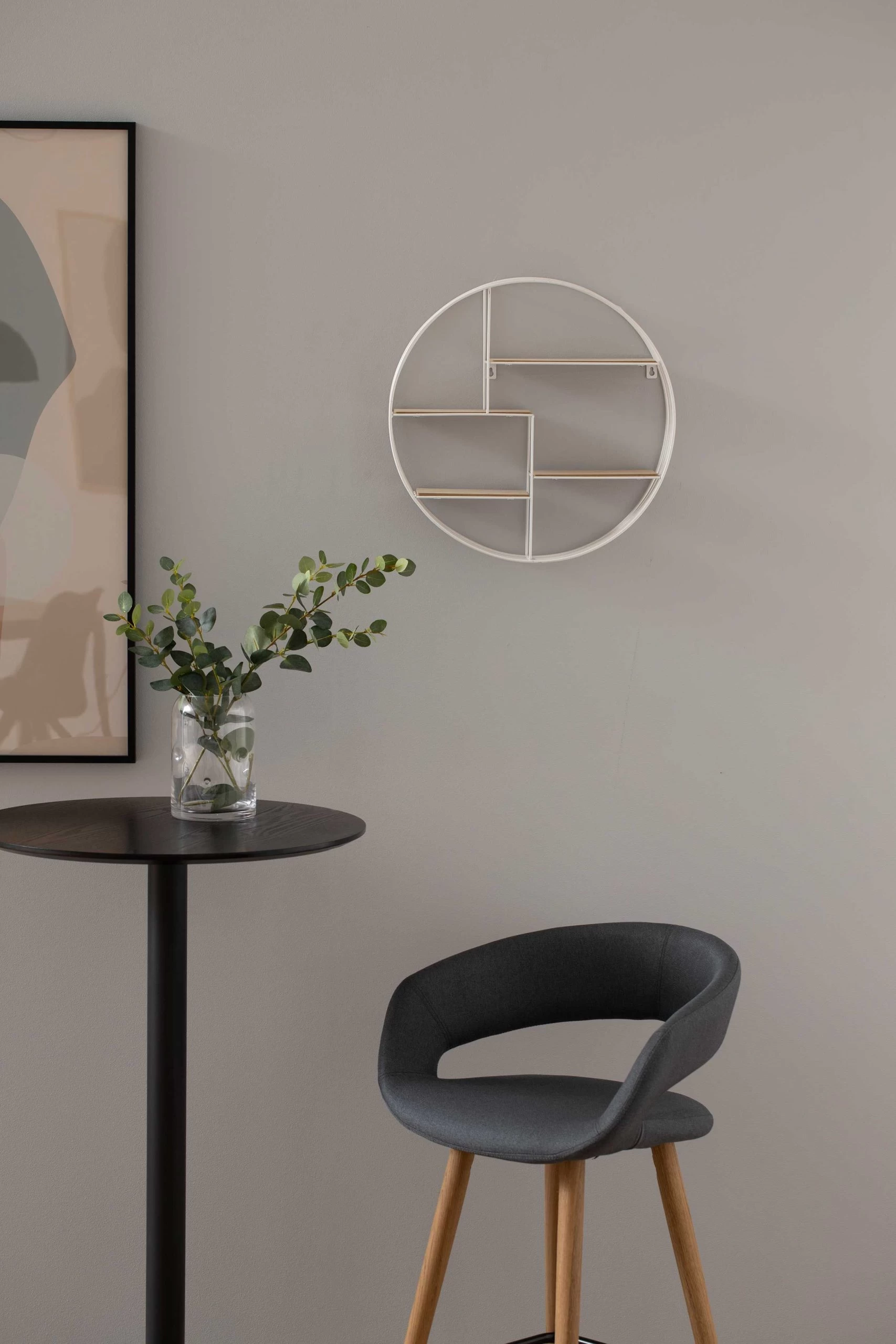Voeg een zachte, witte toets toe aan je moderne interieur met dit Bas-wandrek. Het meubel met diameter 45cm is uitgerust met vier legplanken, waarvan de lengte varieert tussen 17,5cm en 26,3cm. Die legplanken zijn gemaakt uit Paulownia-hout dat wit werd geverfd. Die witte tint vormt een harmonieus geheel met het witte, gepoedercoate metalen frame. Elke legplank kan tot ongeveer 3kg belast worden. Het wandrek is ongeveer 10cm breed en kan eenvoudig aan de muur worden bevestigd. Een praktisch en smaakvol accent in een elegante woonkamerinrichting!